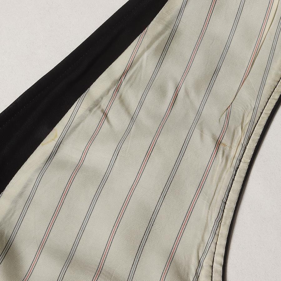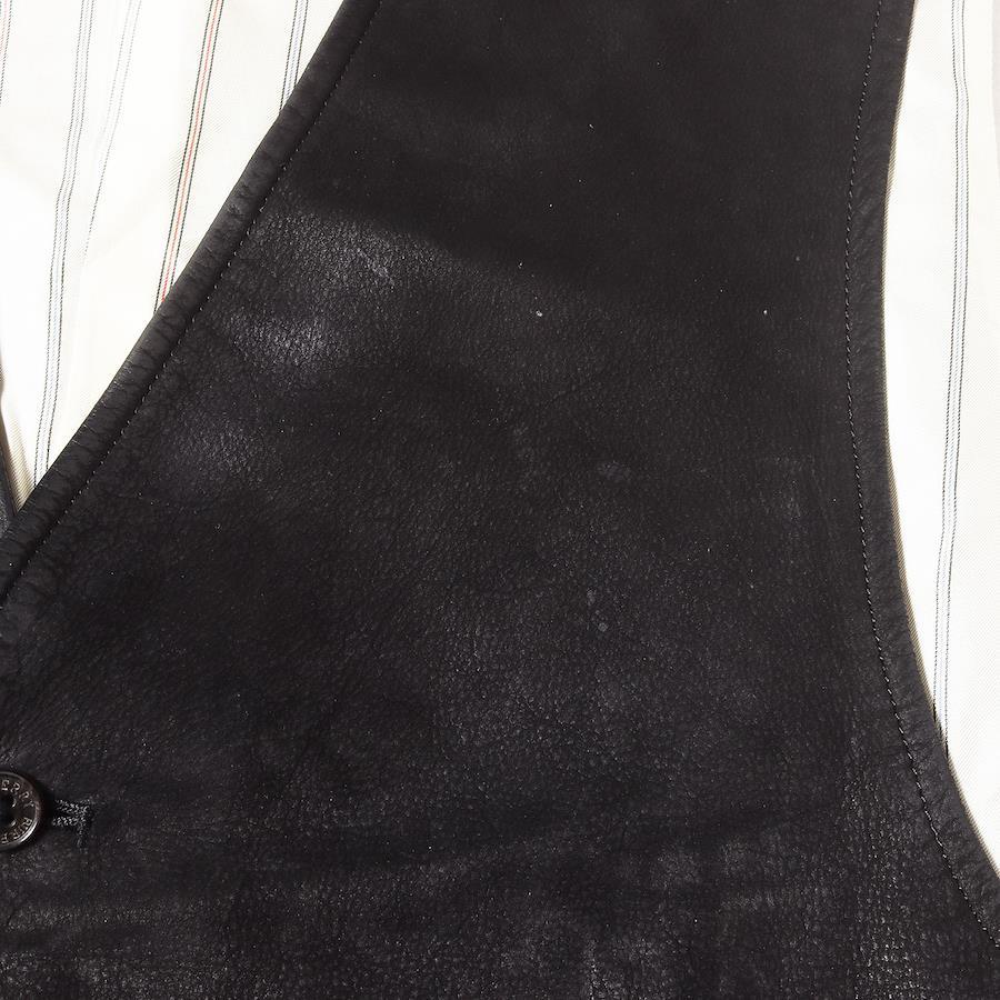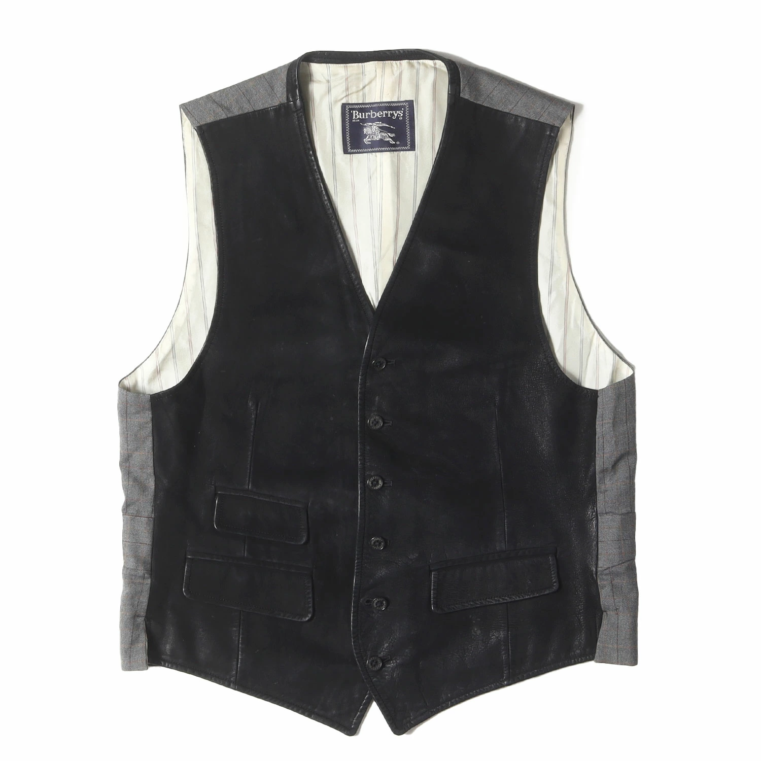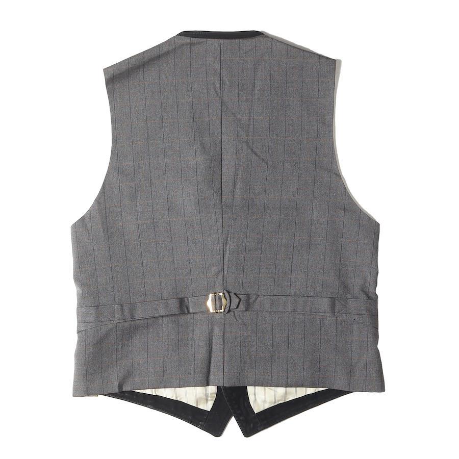 | 商品説明 | ・カウレザー×ウールのコンビベスト ・フロント6つボタン ・ウール面チェック柄 ・背面ウエストベルト ・裏地ストライプ柄 |