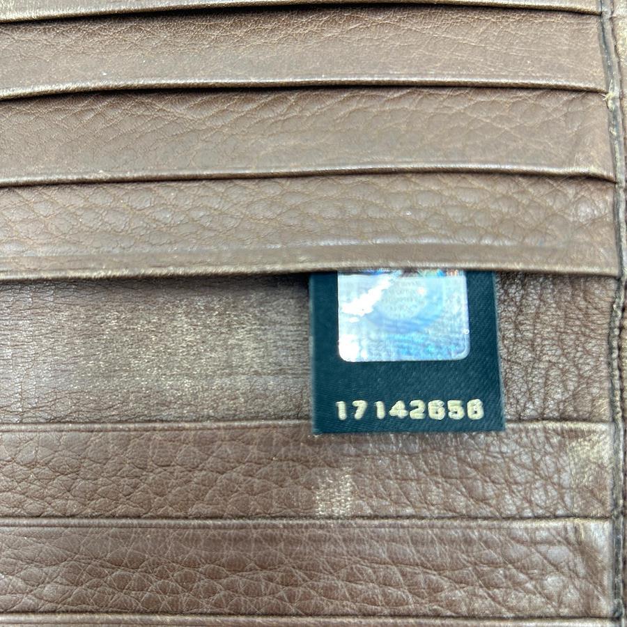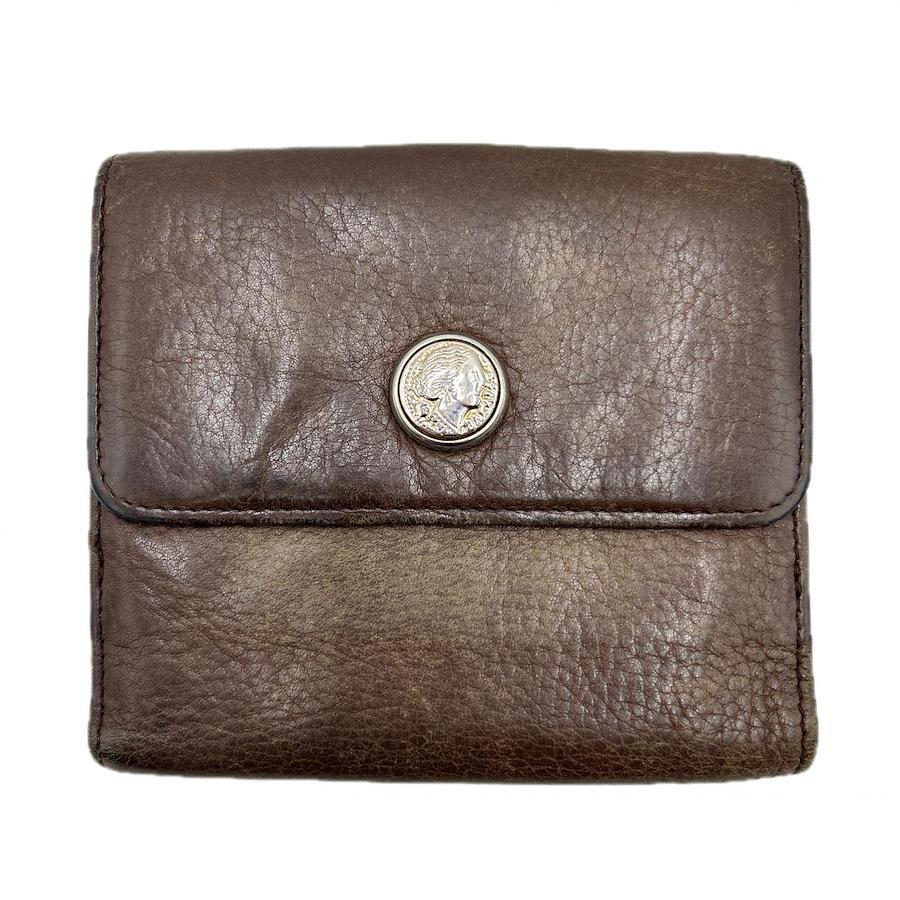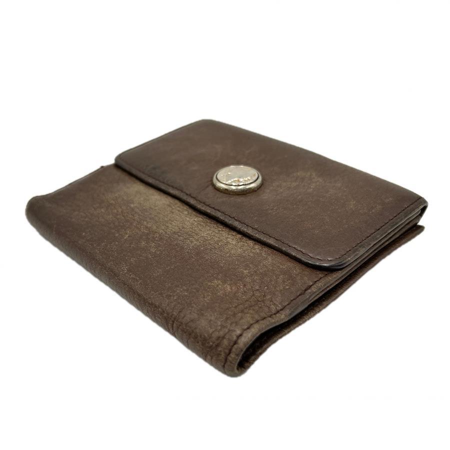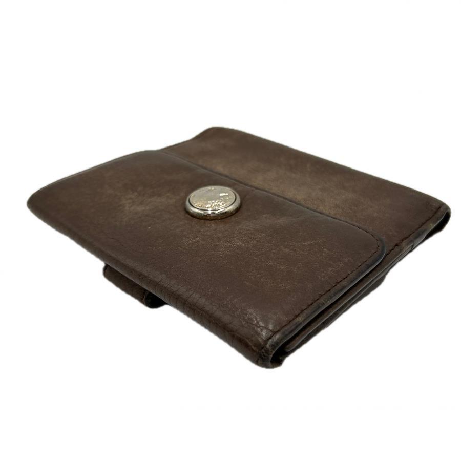 上質なブラウンレザーを使用しており、手に馴染む柔らかな質感が特徴です。正面にはシルバーの丸い装飾とスナップボタンがあしらわれ、ブランドらしいエレガントな雰囲気を演出しています。