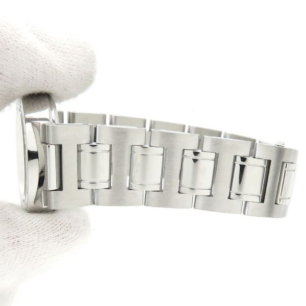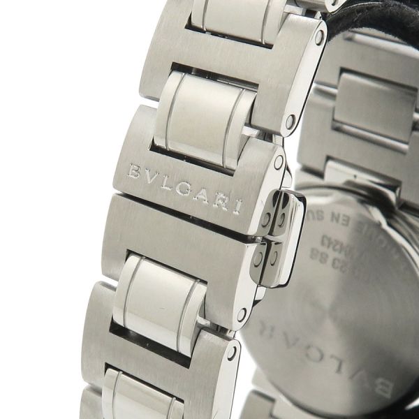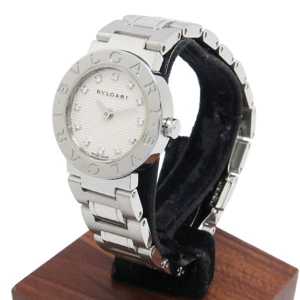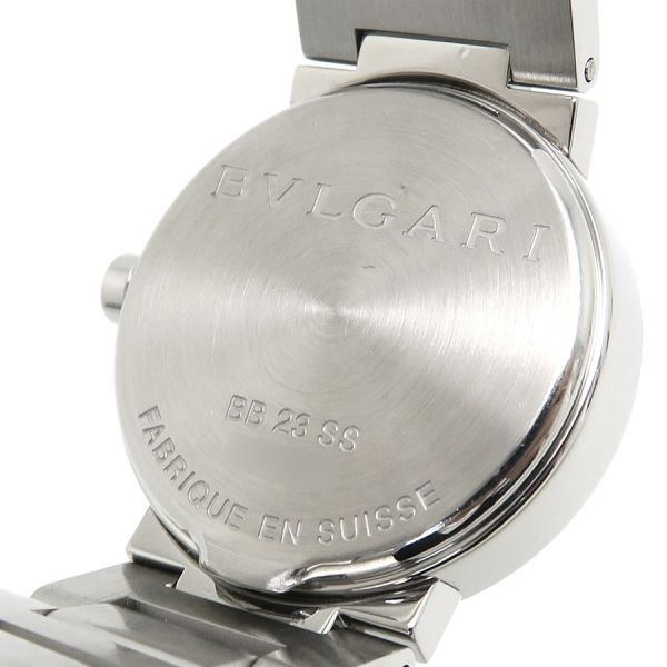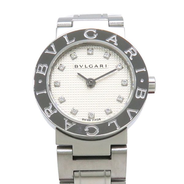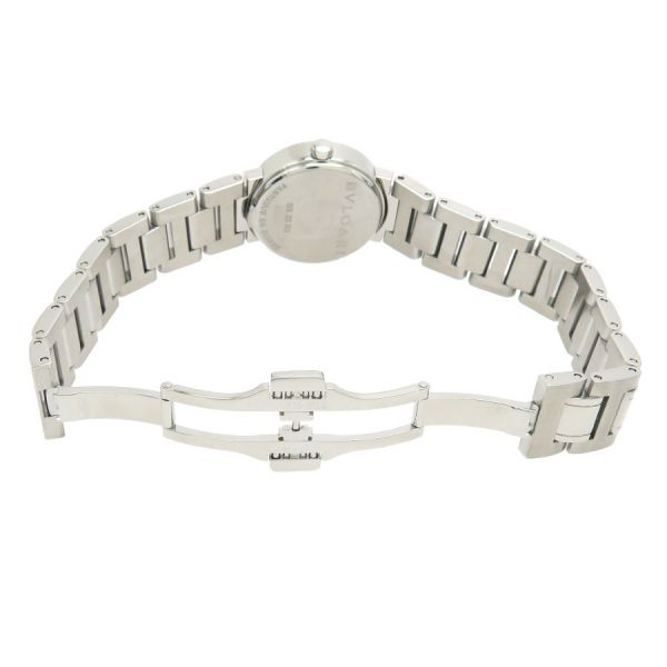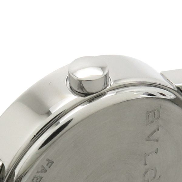 ブルガリを代表する人気の「ブルガリブルガリ」の23mmレディース・ステンレスモデルが入荷致しました。ホワイト文字盤にダイヤインデックスのモデルになります。普段使いにもビジネスシーンにも合せやすいデザインになります。昔のモデルより改良されたプッシュバックルにより一層使いやすくなっています。当社提携の時計修理工房にて外装の仕上げと電池交換を行っております。消しきれなかった傷跡がケースやベゼルや裏蓋に薄く僅かですが残ります。ブルガリを代表するブルガリブルガリは人気のモデルです。