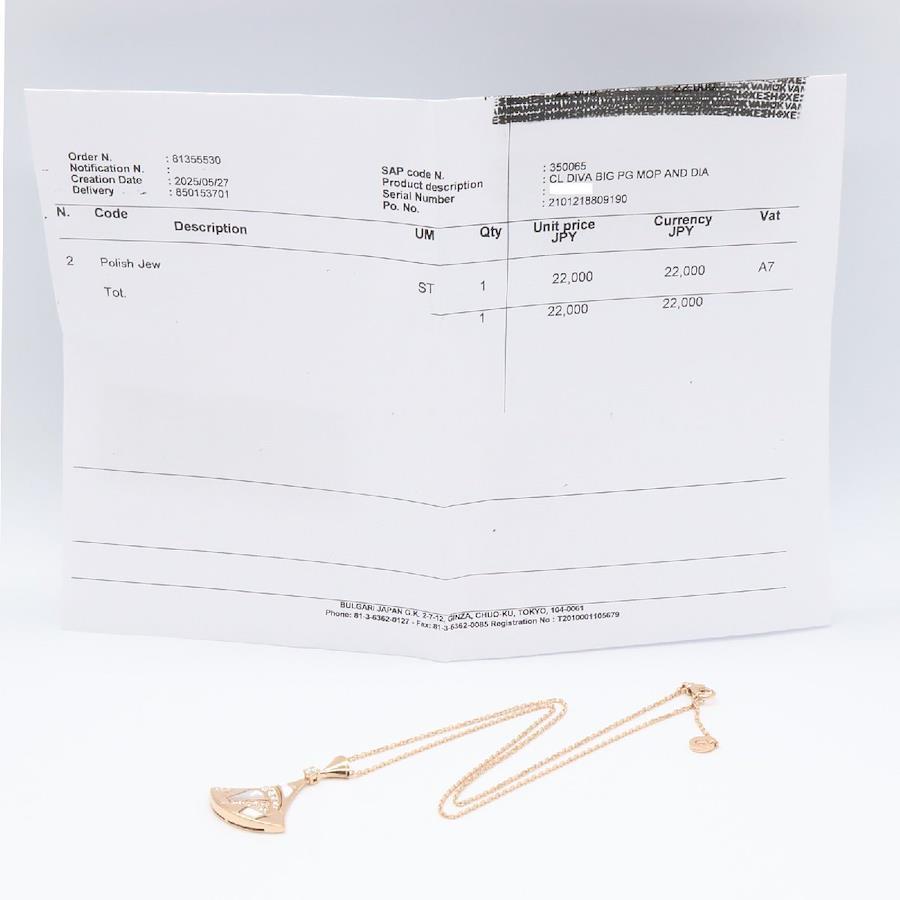 Condition: ASlight signs of wear, scratches, scuffs, and stains.Slight signs of wear. *This item has been polished, but minor scratches may remain. Please note.Brand: BVLGARI (BVLGARI)Product Name: DIVAS' DREAM Necklace, Mother-of-Pearl and DiamondColor: White / ClearMaterial: Mother-of-Pearl and Diamond / 18K Gold (Pink Gold), Diamond, and Mother-of-PearlSize: Neck Circumference: Approx. 42/44cmMotif Width: Approx. 26mm x Height: Approx. 35mm [Including the setting and bail]Weight: Approx. 10.3gSpecifications: -Accessories: Repair Certificate*Items not listed in the accessories column are not included as a general rule.*If an outer box, dust bag, warranty card, etc. are included, their condition is not included in the product ranking.Note: For privacy reasons, we do not display the individual manufacturing number (serial number). Although it is engraved, the actual color may differ from the color displayed on your screen due to display settings and other factors. Thank you for your understanding.