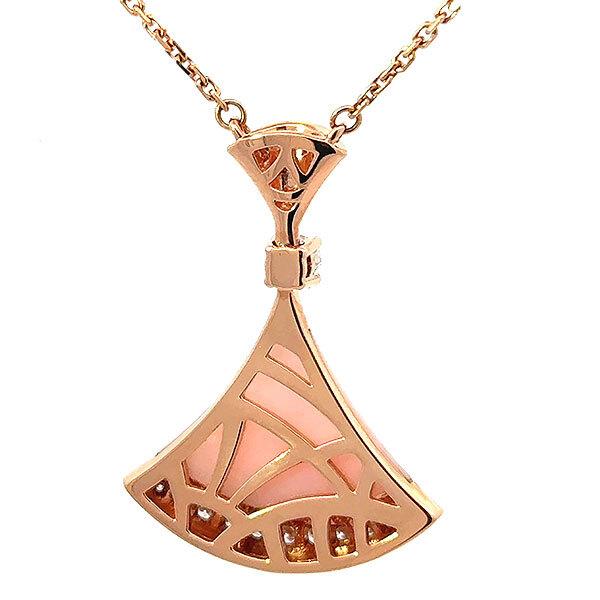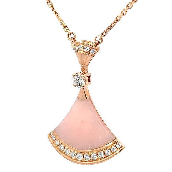 Comment: This necklace from BVLGARI's popular "DIVAS' DREAM" collection features a feminine pink opal, symbolizing good fortune. The necklace features a gracefully curved fan-shaped motif and delicately adorned with sparkling diamonds, accentuating a soft femininity.