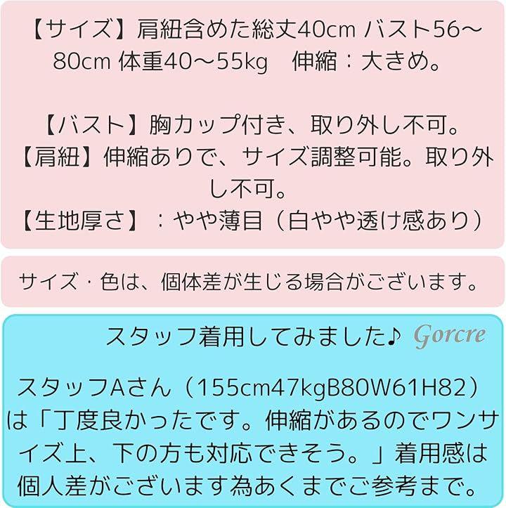 「生地厚さ」:やや薄目(白やや透け感あり)「セット内容」キャミソール1点(胸パット付き)