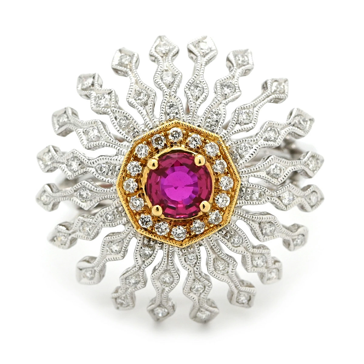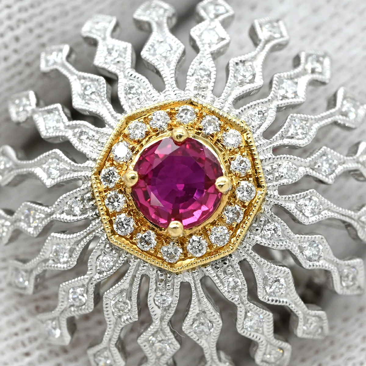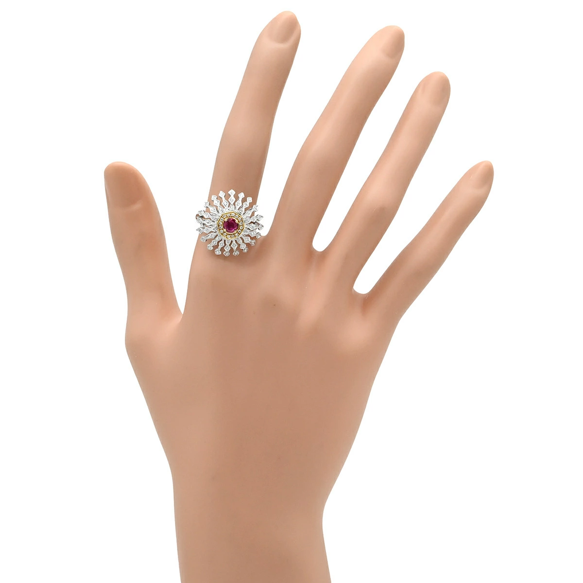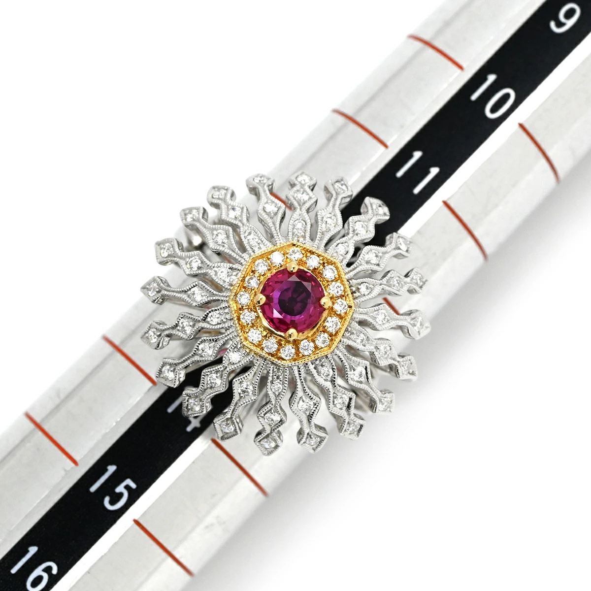 Carl Blackburn Ring, Diamond, Ruby, White Gold and Red Gold (Au750), 18K, Domed, Flower Motif, Openwork, Size 13, Pre-owned, Boxed