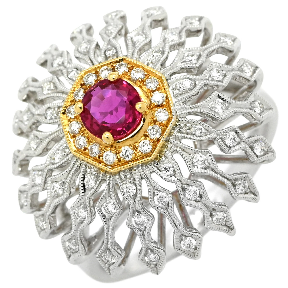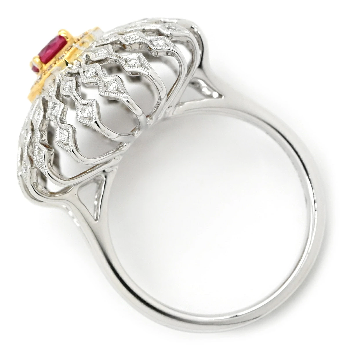 【 カール・ブラックバーン CARL BLACKBURN リング 指輪 ダイヤ ルビー K18WG/ダイヤモンド 0.45ct/ルビー 0.32ct ホワイトゴールド×レッドホワイトゴールド Au750 18K ドーム型 フラワーモチーフ 透かし彫り - 13号 レディース【箱】 定番 人気 美品 【中古】】