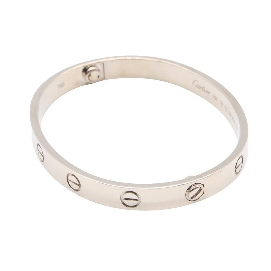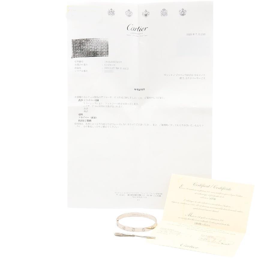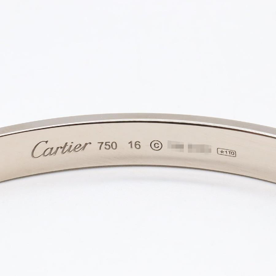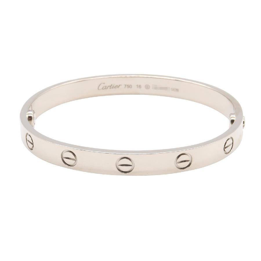 Condition Rank: ASlight signs of wear, scratches, scuffs, and stains are visible.Slight signs of wear are visible. *This item has been polished, but there may be minor scratches that cannot be removed. Thank you for your understanding.Brand Name: CARTIERProduct Name: Love BraceletColor: SilverMaterial: K18WG (White Gold)Size: Wrist Circumference: Approx. 15cmWidth: Approx. 5.8mmWeight: Approx. 29.8gSpecifications: NoneAccessories: Warranty, Repair Certificate*Items not listed in the accessories section are not included as a general rule.*If an outer box, dust bag, warranty card, etc. are included, their condition is not included in the product rank.Notes: Screwdriver includedStamp: 16Other: Colors displayed on your screen may differ from the actual color depending on your display settings. Thank you for your understanding.