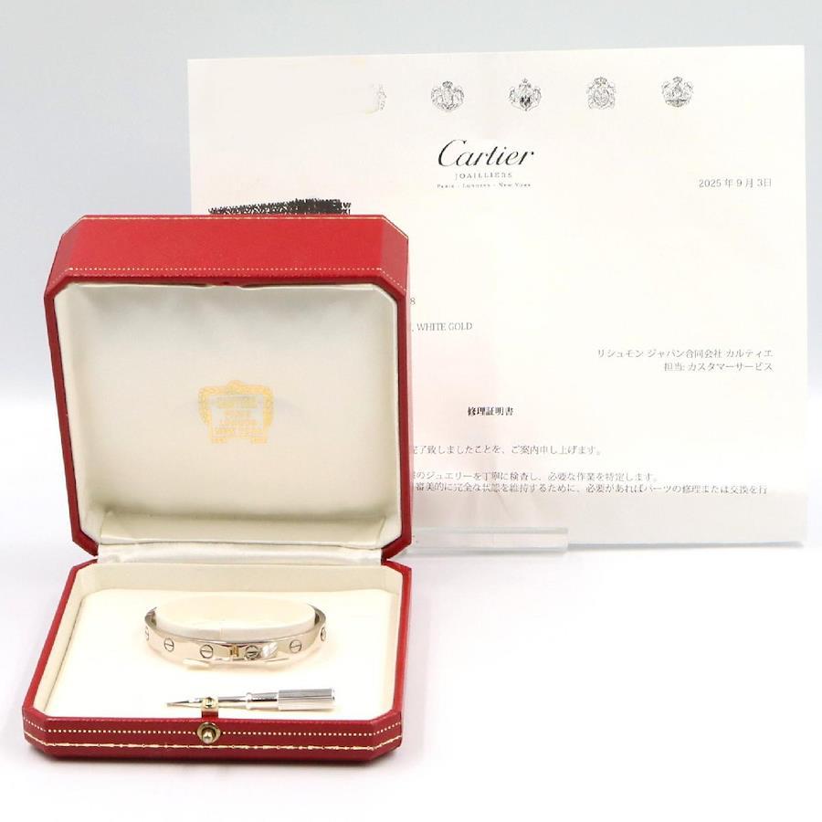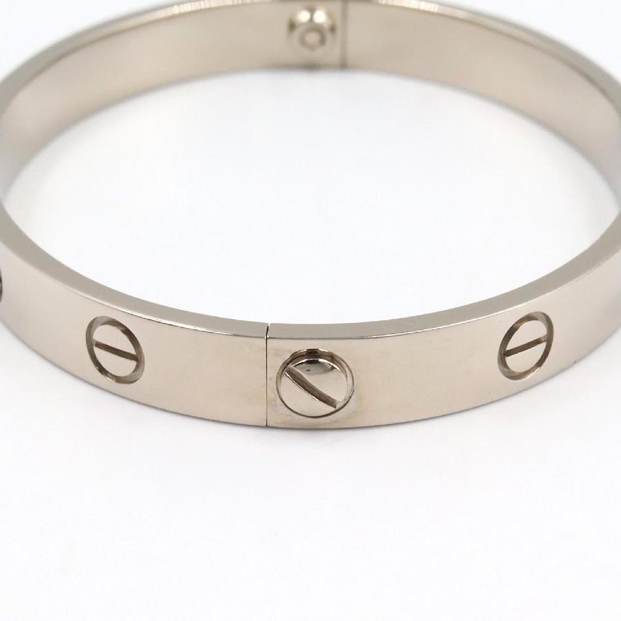 Condition: ASlight signs of wear, scratches, scuffs, and dirt are visible.Brand: CARTIERProduct Name: Love BraceletColor: SilverMaterial: 18K White Gold (White Gold)Size: Wrist circumference: Approx. 15cmWeight: Approx. 32.5gSpecifications: NoneAccessories: Case, Repair Certificate, Screwdriver*Items not listed in the accessories section are not included as a general rule.*If an outer box, dust bag, warranty card, etc. are included, their condition is not included in the product rank.Notes:Please note that the colors displayed on your screen may differ from the actual colors due to display settings and other factors.