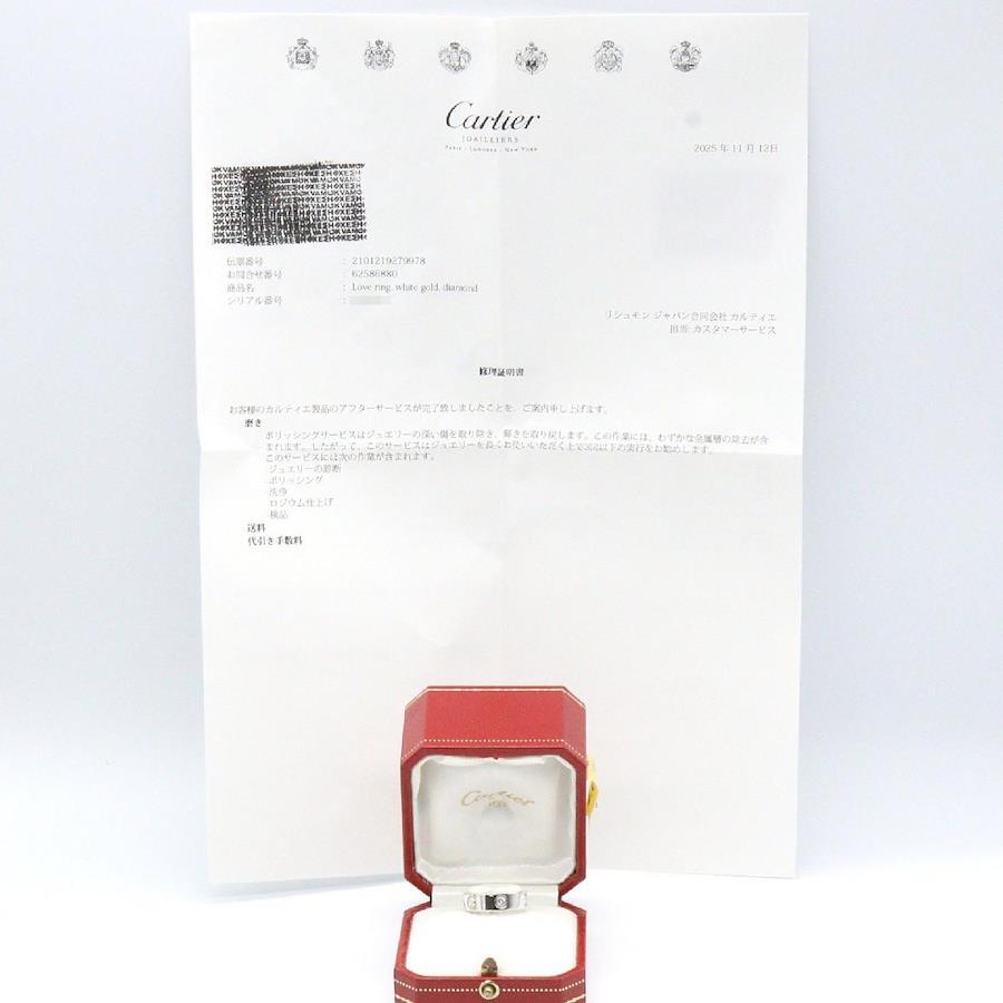 Condition Rank: ASlight signs of wear, scratches, scuffs, and dirt are visible.Brand: CARTIERProduct Name: Love Ring 6PD RingModel Number: B4032552Color: Silver/ClearMaterial: K18WG (White Gold) with DiamondSize: 11.5Weight: Approximately 8.6gSpecifications: -Stamp: 52Accessories: Case, Repair Certificate*Items not listed in the accessories column are not included as a general rule.*If an outer box, dust bag, warranty card, etc. are included, their condition is not included in the product ranking.Notes: There are some signs of use. *This item has been polished, but there may be small scratches that cannot be removed. Please be aware of this.Individual manufacturing numbers (serial numbers) are not displayed to protect personal information. They are actually engraved.Other: Depending on the display environment and settings, the colors displayed on your screen may differ from the actual colors. Please be aware of this.