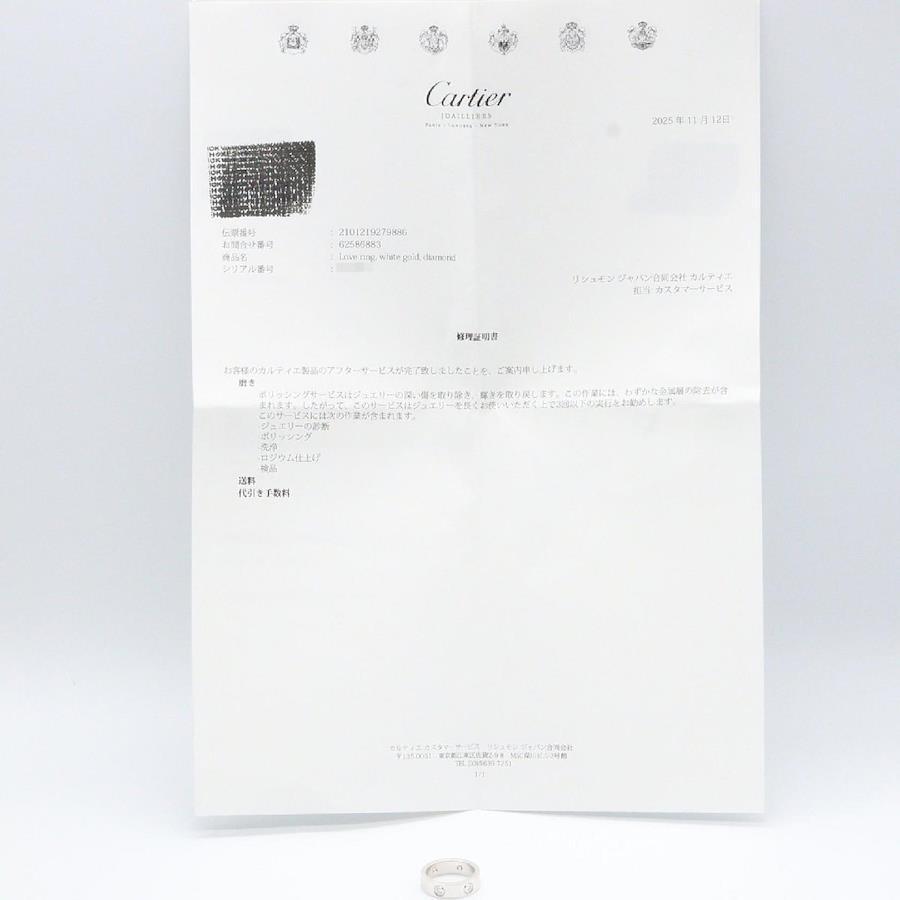 Condition Rank: ASlight signs of use, scratches, scuffs, and dirt are visible.Brand: CARTIERProduct Name: Love Ring 6PD RingColor: Silver / ClearMaterial: K18WG (White Gold) with DiamondSize: 11Weight: Approximately 8.9gSpecifications: -Stamp: 52Accessories: Repair Certificate*Items not listed in the accessories section are not included as a general rule.*If an outer box, dust bag, warranty card, etc. are included, their condition is not included in the product rank.Note: Slight signs of use are visible. *This item has been polished, but minor scratches may remain. Thank you for your understanding.For privacy reasons, we do not display the individual manufacturing number (serial number). However, it is engraved.Please note that the color displayed on your screen may differ from the actual color depending on your display environment and settings.