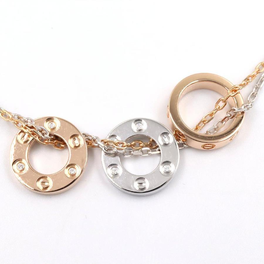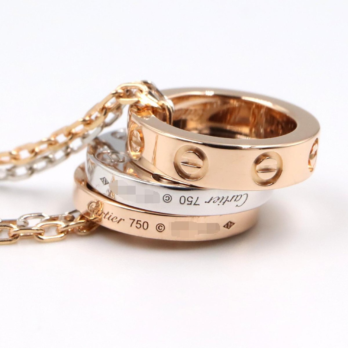 Condition: ASlight signs of wear, scratches, scuffs, and dirt.Brand: CARTIERProduct Name: Love Three Hoop Necklace 3PDColor: Gold / Silver / ClearMaterial: K18PG (Pink Gold) x K18WG (White Gold) x DiamondSize: Neck Circumference: Approx. 37.5-40.5cmW: Approx. 0.2cmChain Length: Approx. 37.5-40.5cmTop: Approx. 10mm W x Approx. 10mm HMotif Width: Approx. 10mm x Height: Approx. 10mm [Including the frame and bail]Weight: Approx. 9gSpecifications: -Accessories: Dust bag*Items not listed in the accessories column are not included as a general rule.*If an outer box, dust bag, warranty card, etc. are included, their condition is not included in the product ranking.Notes: There are some signs of use. *This item has been polished, but there may be small scratches that cannot be removed. Please be aware of this.Individual manufacturing numbers (serial numbers) are not displayed to protect personal information. They are actually engraved.Other: Depending on the display environment and settings, the colors displayed on your screen may differ from the actual colors. Please be aware of this.