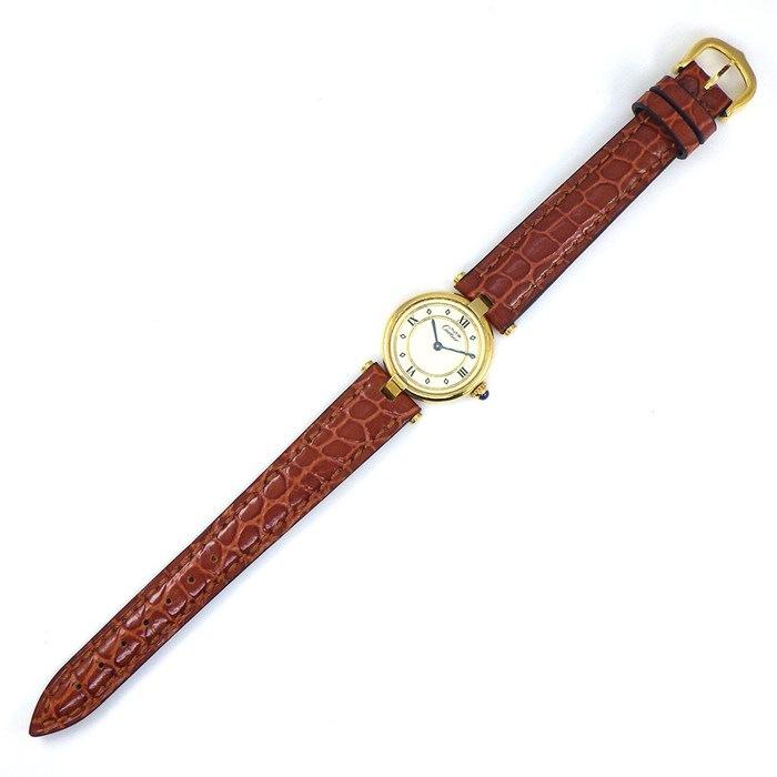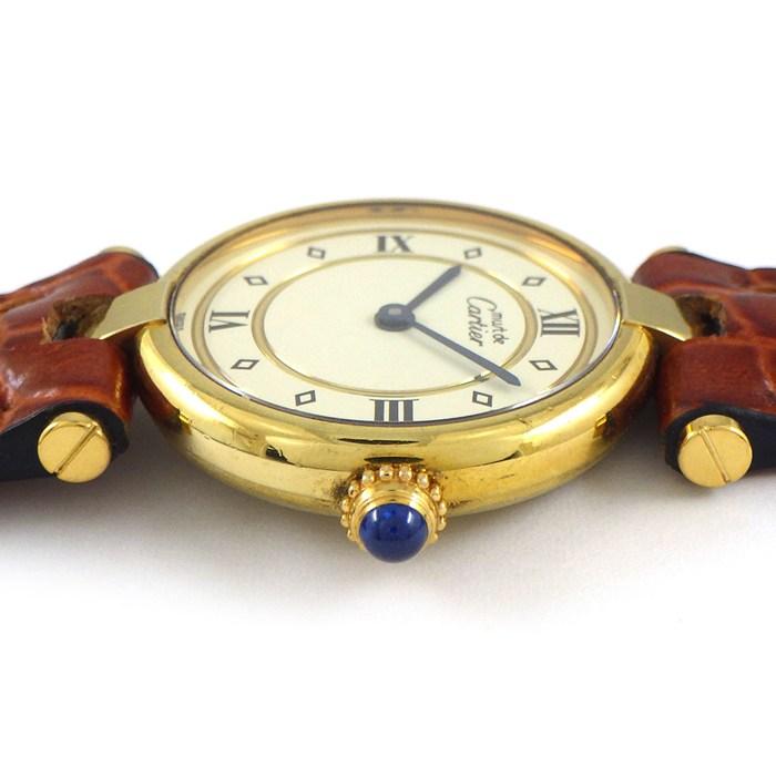 Cartier Must Vendôme SM 590004 watch with an ivory dial, Roman numerals, brown calfskin leather strap, and GP SV925 quartz movement.