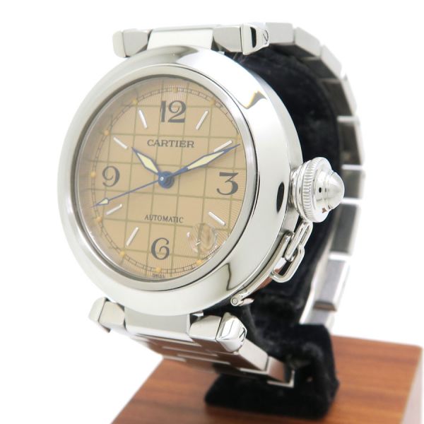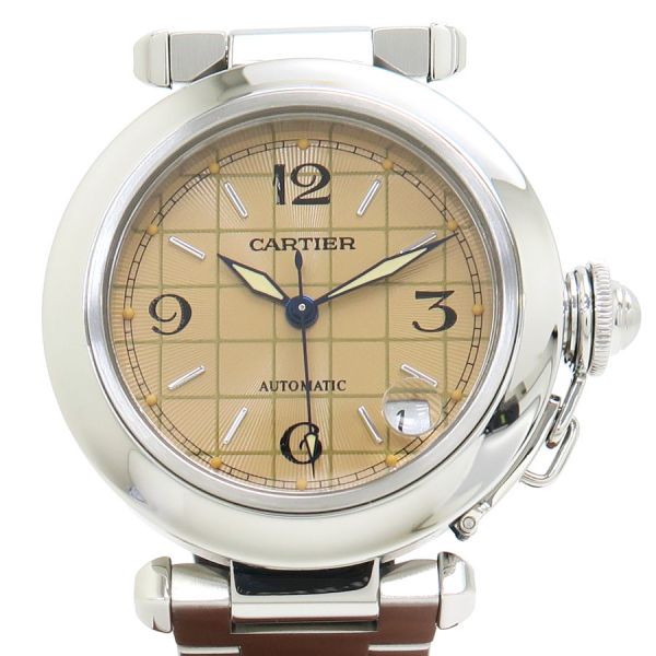 カルティエの人気モデル「パシャC」が入荷しました。現在は女性向けサイズという認識の方が多いですが基本的には男女兼用でお使い頂けます。落ち着いた深みのあるオレンジダイアルも実に印象的です。当社提携の時計修理工房にて外装の新品仕上げと内部調整を行っております。裏蓋に擦れ、ブレスレットに擦れがございます。カルティエの根強い人気を誇るパシャをお見逃し無く。