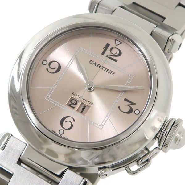 カルティエの人気モデル、パシャCビッグデイトが入荷致しました。淡いピンクダイヤルに6時位置の大きなデイト表示を配置した視認性の良い時計です。メンズはもちろんのこと大きめサイズをお探しのレディースにもおススメの一本です。当社提携の時計修理工房にて外装の新品仕上げと内部調整を行っております。文字盤中央に小傷、ベゼルに擦れ、ラグ部分に小傷、裏蓋に傷、ブレスレットに擦れがございます。カルティエの人気モデル パシャをお見逃し無く。