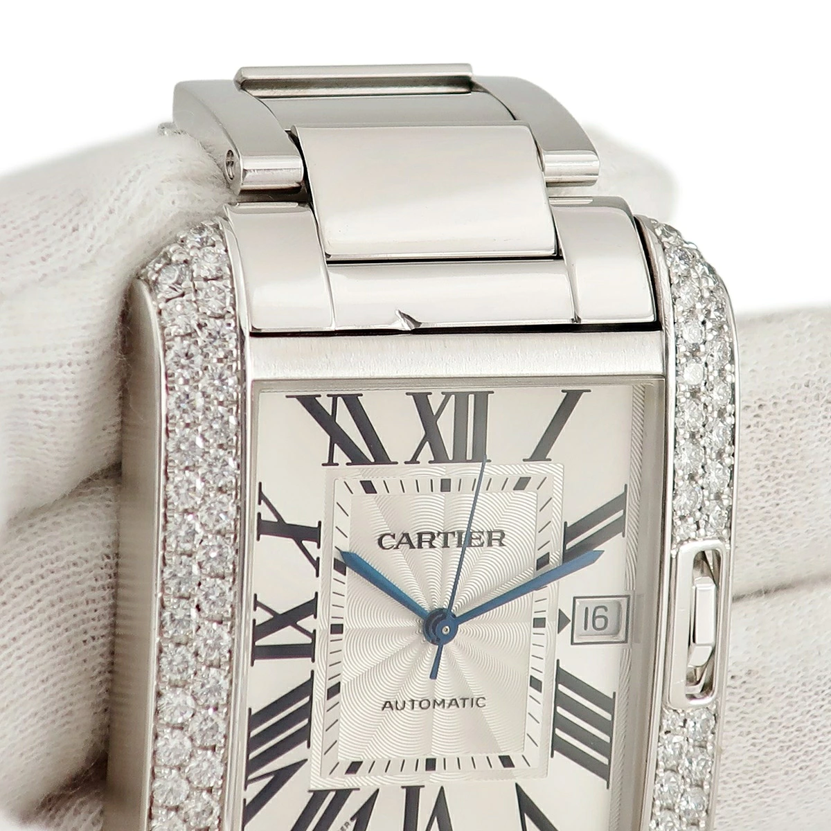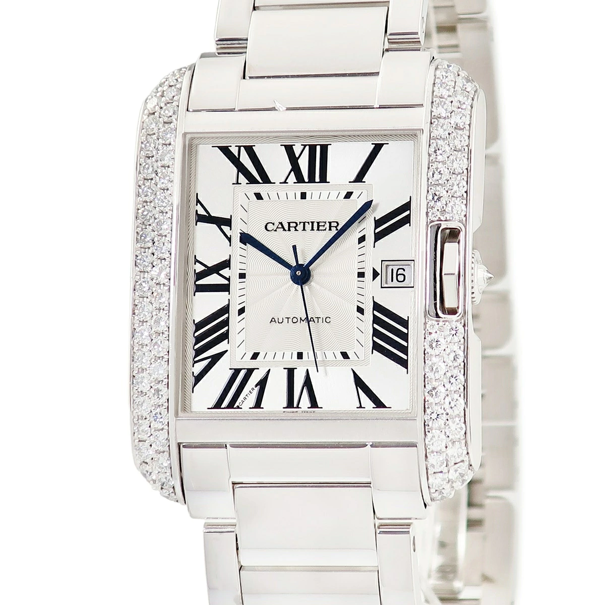 カルティエ Cartier タンク アングレーズ XL WT100010 K18WG無垢 純正ダイヤ 青針 ギョウシェ デイト メンズ 腕時計自動巻き シルバー 【中古】【店頭受取不可】