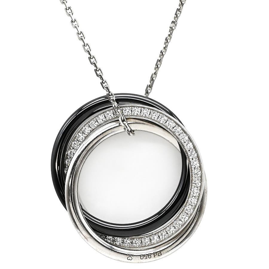 Cartier Necklace, 18K Gold (K18WG), PD950 Diamond, Ceramic, White Gold and Black, 750, 3-Strand, Men's, Women's, Unisex, [Box], Classic, Popular, Excellent Condition, Pre-OwnedBrand: CartierFeaturesColor: White Gold and BlackMaterial: 18K Gold (K18WG), PD950, Diamond, CeramicSize: Total Length: 45cmBracelet: 20mm W x 22mm HSingle Ring: Approx. 19mm x 19mm, Chain: Adjustable with Two Clasps (42cm/45cm)Stones: DiamondWeight: 5.8gAccessories: Inner Box, Outer Box*No accessories other than those listed are included.Rank: A [Overall Condition Details]There is minor damage due to use and storage, but the item is in relatively good condition. *See images and comments.[Condition Details] Pre-Owned, Excellent ConditionThere are minor scuffs and scratches.