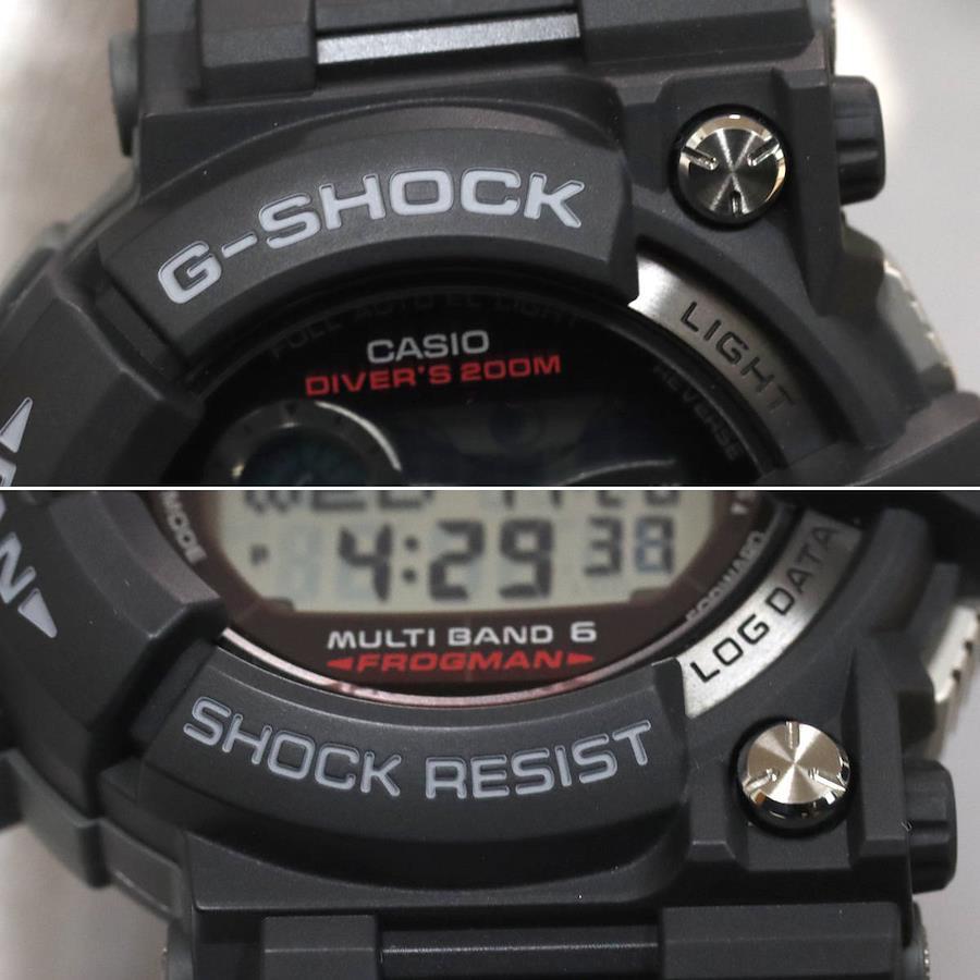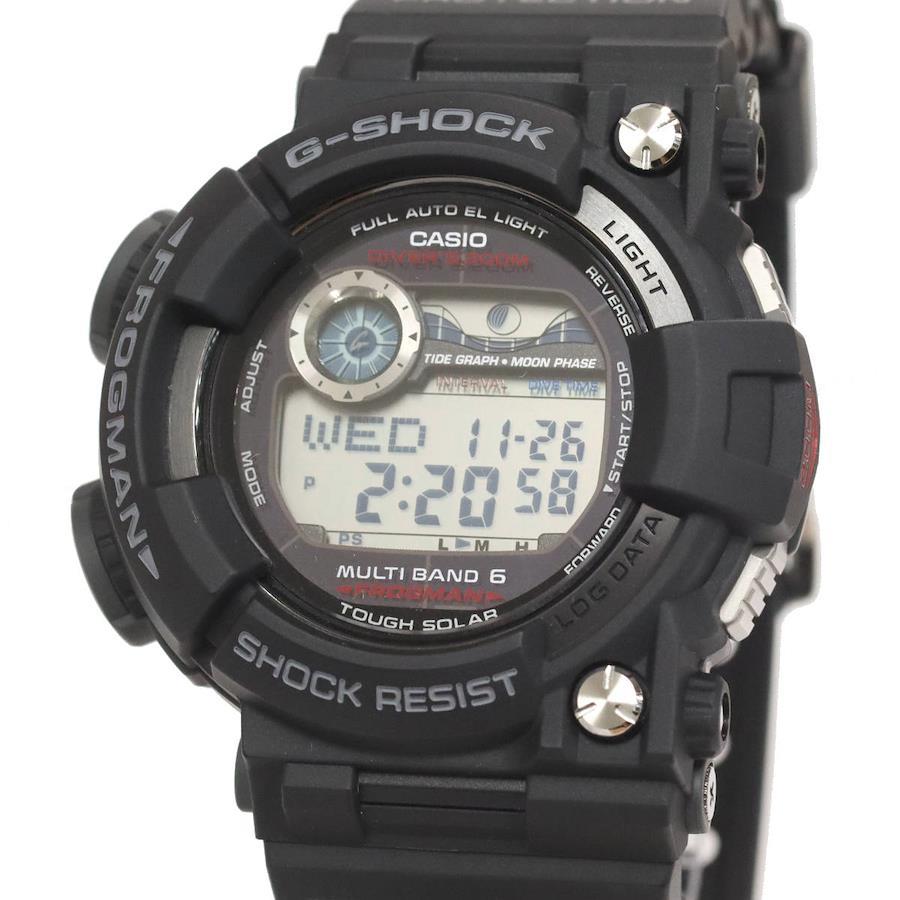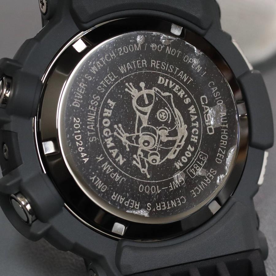 カシオのメンズウォッチ、G-SHOCK MASTER OF G-SEA FROGMAN(GWF-1000-1JF)の中古品です。風防の縁のベゼルに小傷があります。ケース裏の保護シールに傷があります。ベルトのバックルに小傷があります。ベルトにバックルの跡がついています。外箱に傷があります。保証書が付属し、記載の購入日は2011年6月19日です。付属品は以下の通りです。内外箱(傷あり)取扱説明書兼保証書+---+---+---+---+---+。{状態}ケースABベルトA{素材}ケースSS/樹脂ベルト樹脂{サイズ} ケース:約52.8mm ,ストラップ:MAX約22cm。{ムーブメント}タフソーラー{その他}ISO規格200M潜水用防水フルオートカレンダーストップウォッチ etc...。{付属品}内外箱,取扱説明書兼保証書{お問合せ商品番号}25116024+---+---+---+---+---+。