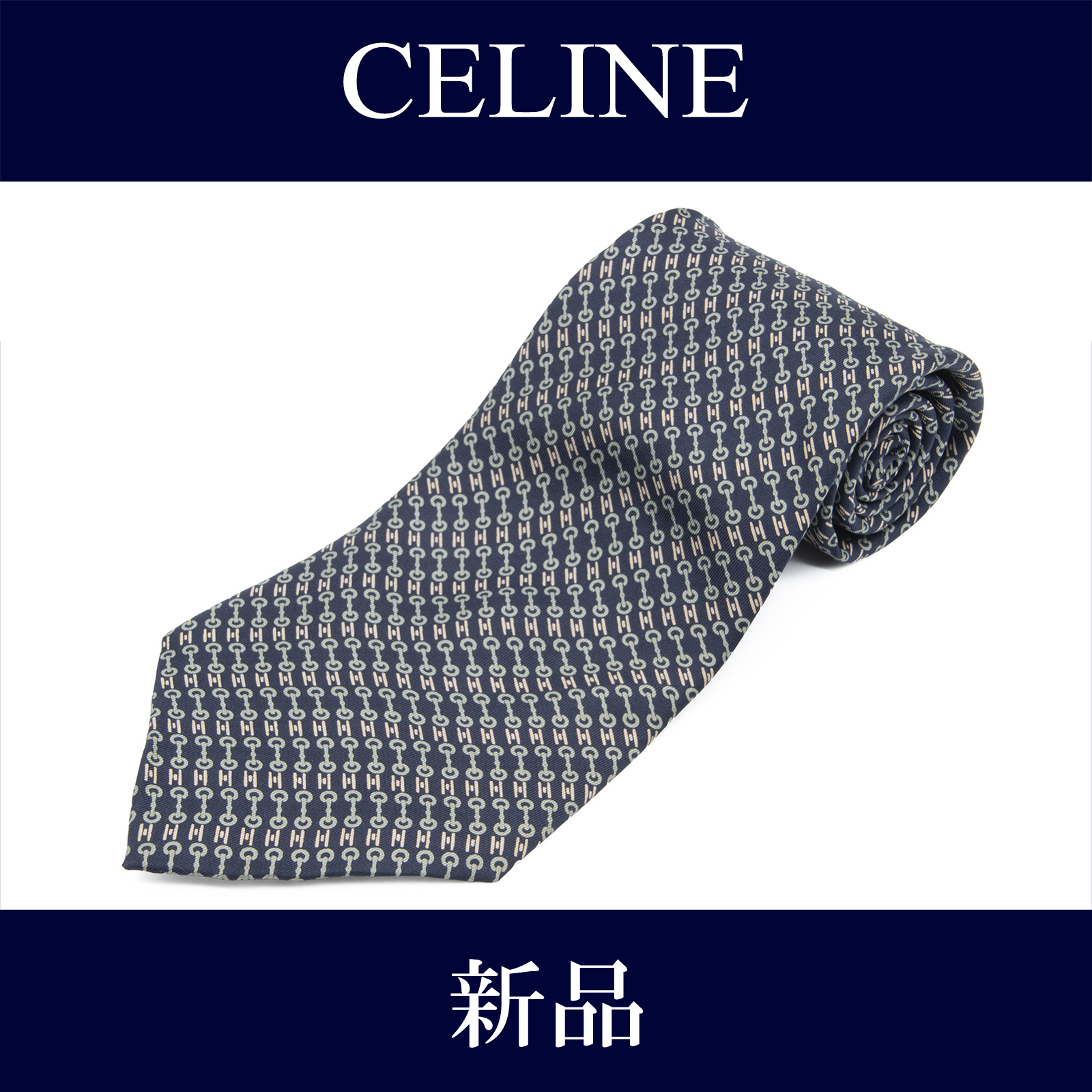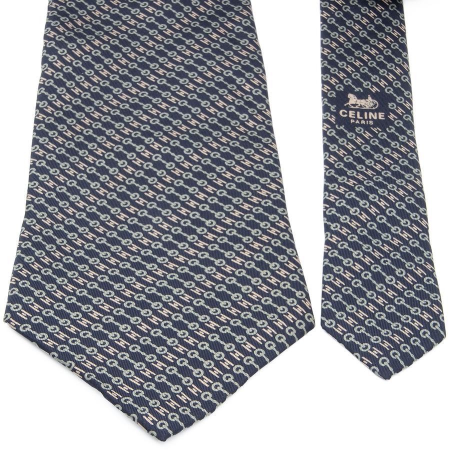 Celine tie, wide, printed, new, for men and women, silk, blue, navy blue, light blue, French gray, beige, business, casual, popular brand, horsebit all-over print, logo, rare, stylish, made in France, beautiful, N694