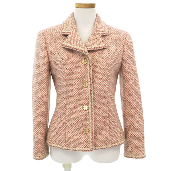 ■採寸#34 肩幅:37cm 袖丈:51cm B:80cm 着丈:52cm■素材表地:カシミヤ100% シルク100%■コメントシャネルから01Aジャケットが入荷しました!ピンクや白を基調とした華やかで可愛らしい印象のツイードジャケット☆襟や前立て・袖などにあしらわれた立体感のあるブレードトリミングや、同じツイードのココマークボタンも素敵なデザインです!全体に生地特有の起毛や端の毛羽立ち、左袖内側裏地部分に糸引きや毛羽立ちが見受けられる為Bランクでのご紹介となりました。目立つダメージや汚れはなく状態良好でAランク寄りのお品となっております◎