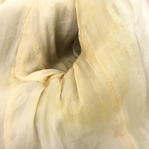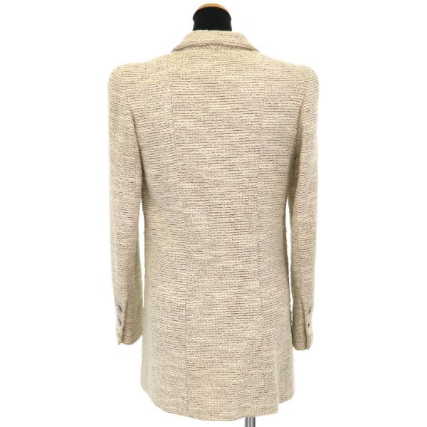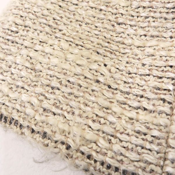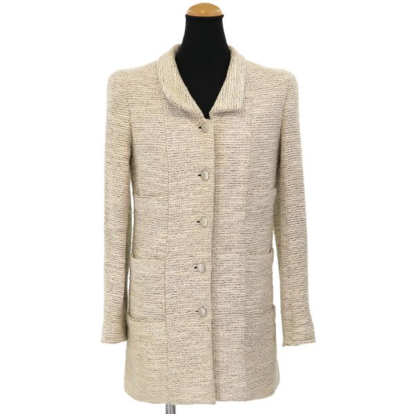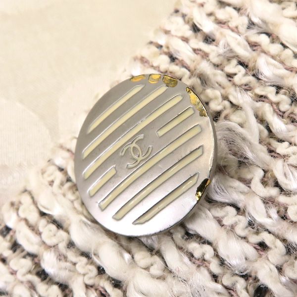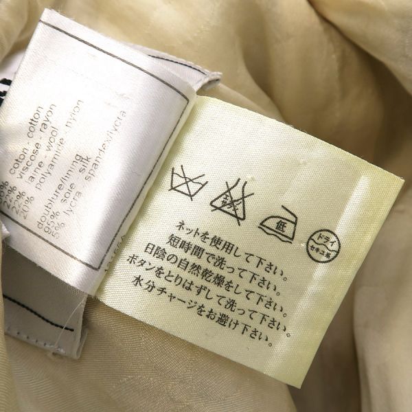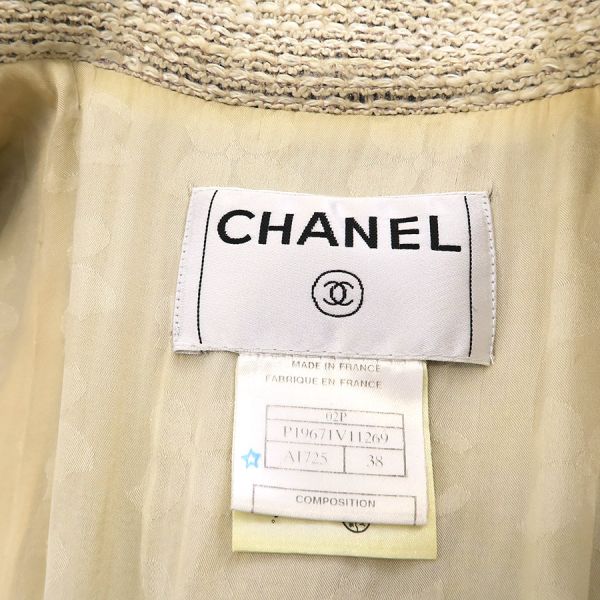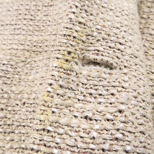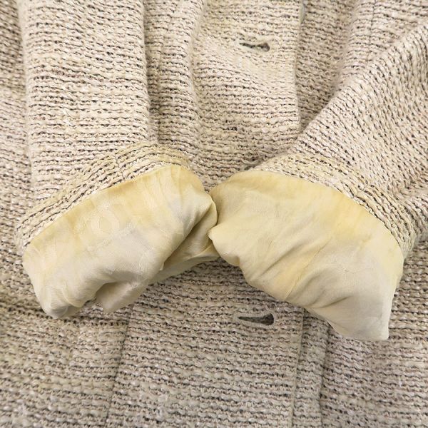 ■採寸#38 肩幅:38cm 袖丈:56cm B:80cm 着丈:72cm■素材表地:コットン36% レーヨン22% ウール22% ナイロン20%裏地:シルク95% スパンデックス5%■コメントシャネルから02Pジャケットが入荷しました!アイボリー系カラーのツイードジャケットで、着まわしがしやすいデザインと長めの丈感が素敵なお品です☆全体に起毛や毛羽立ち、前右裾付近に強い毛羽立ち、ボタンのスレキズや汚れ・メッキ剥がれ、両袖口裏地の黄ばみ、後身頃左右それぞれアームホール横に糸引き、襟裏の黄ばみ、襟タグに星マークのスタンプ跡、両脇下裏地の黄ばみ、両脇下表地に薄っすらと黄ばみ、前第4ボタンホール周り内側に茶シミ、前左右それぞれポケット下に薄い茶シミが見受けられる為Cランクでのご紹介となりました。