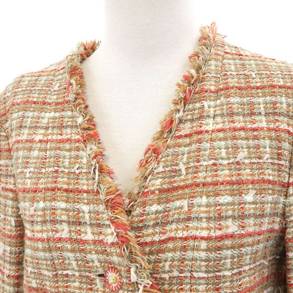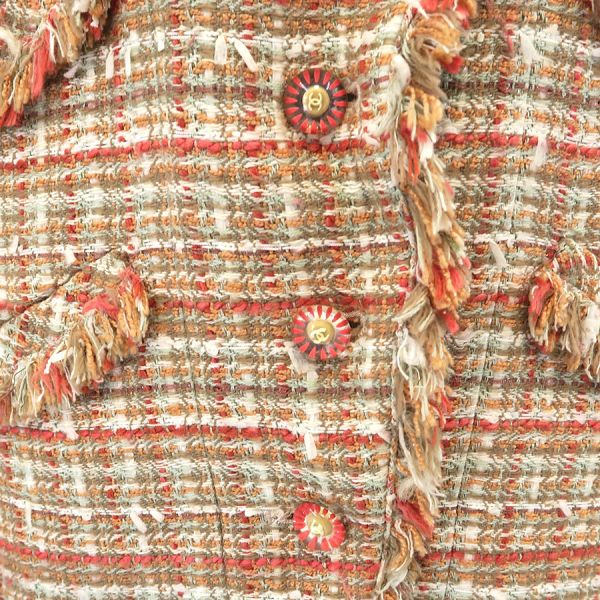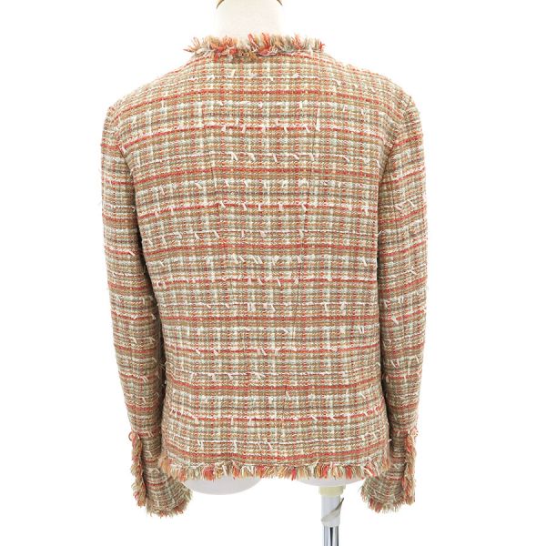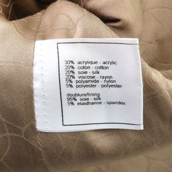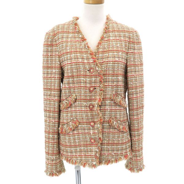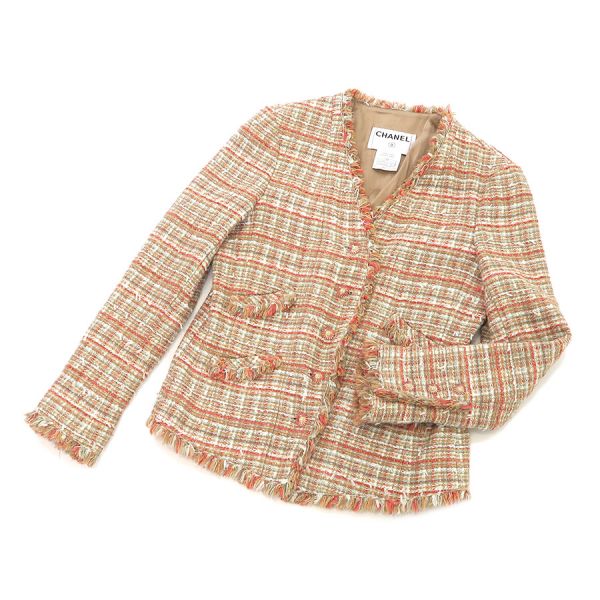 ■採寸#38 肩幅:41cm 袖丈:59cm B:98cm 着丈:52cm■素材アクリル30% コットン20% シルク20% レーヨン20% ナイロン5% ポリエステル5% 裏地:シルク95% スパンデックス5%■コメントシャネルから04Pジャケットが入荷しました。ココマークボタンが可愛らしいツイードジャケットです☆状態は全体にやや起毛感・毛の乱れ、左袖口に糸ツレ、袖口裏や裏脇の薄汚れ等が見受けられますのでBランクでのご紹介です。目立つ汚れやダメージはないので、まだまだ問題なくご着用いただけます◎