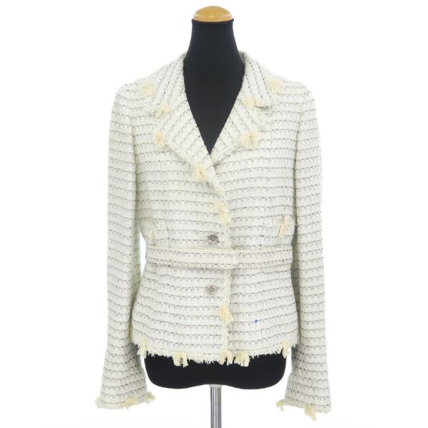■採寸#38 肩幅38cm 袖丈63cm B92cm 着丈52cm■素材コットン52% レーヨン32% リネン14% ナイロン2%裏地 シルク96% スパンデックス4%■コメントシャネルから05Cジャケットが入荷しました!脇裏や肩裏、襟裏など広範囲に黄ばみ汚れ、袖裏に茶色い汚れ、裏地右裾上や左裾上などに糸引き、ボタンに小キズやスレ、くすみ、黒ズミ汚れ、フリンジに乱れやヨレや汚れ、全体に起毛感やシワ、収納跡、ヨレがみられるためBランク評価になります。