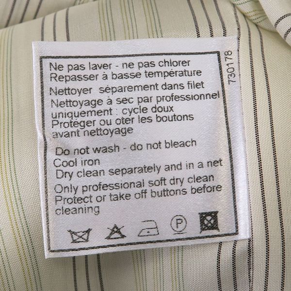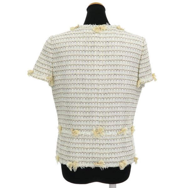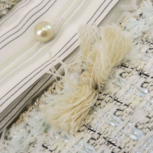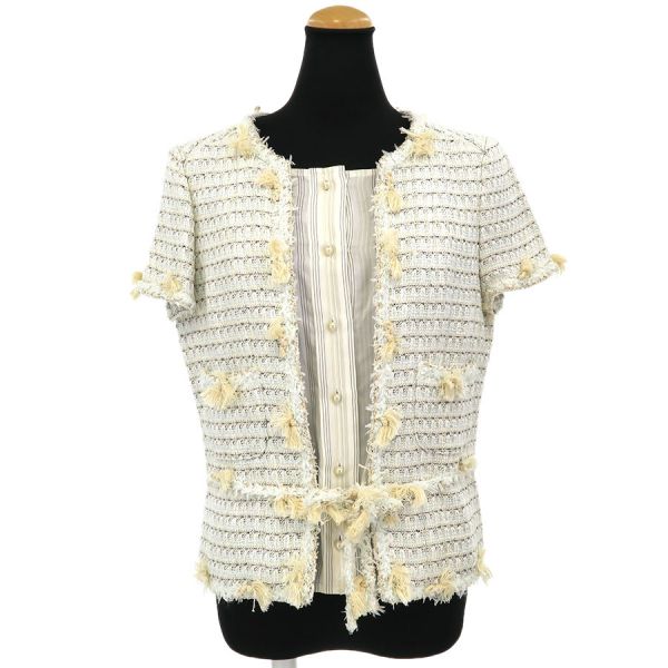 ■採寸#38 肩幅38cm 袖丈18cm B88cm 着丈51cm■素材コットン52% レーヨン32% リネン14% ナイロン2%裏地 シルク100%■コメントシャネルから05Cジャケットが入荷しました!フリンジに乱れやヨレ、絡まり、タグ上に糸引き、左腕に糸の飛び出し、右ポケットにホツレ、全体にシワや収納跡、ヨレ、起毛感がみられるためBランク評価になります。