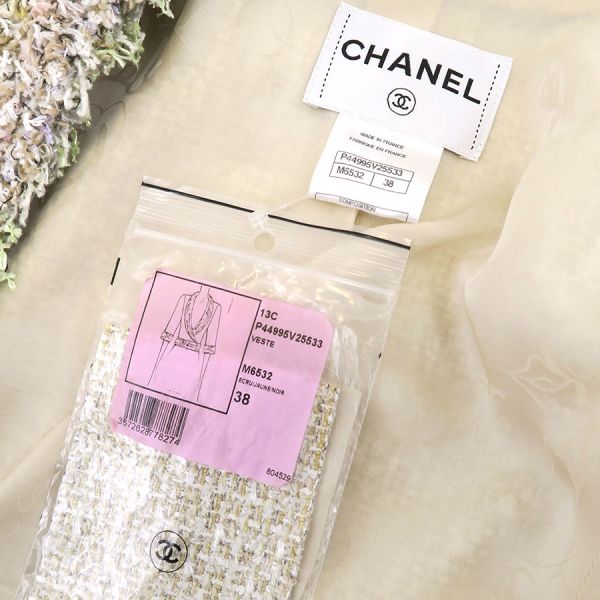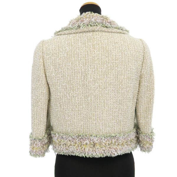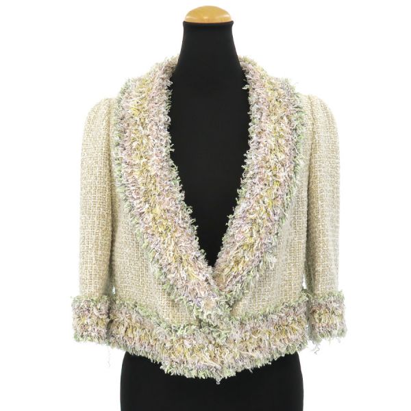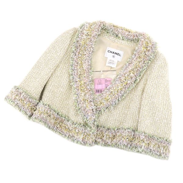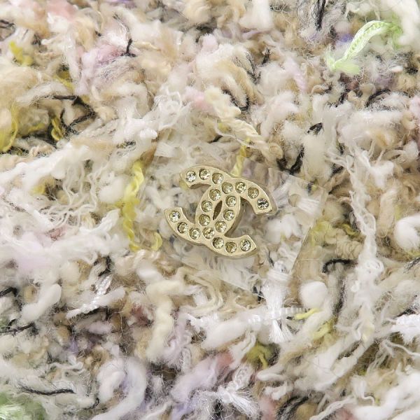■採寸#38 肩幅:35cm 袖丈:38cm B:88cm 着丈:41cm■素材表地:ナイロン36% コットン28% レーヨン22% シルク14%裏地:シルク100%■コメントシャネルから13Cジャケットが入荷しました!多色の糸を編み込んだ表情豊かなツイードジャケットで、襟元や袖口にあしらわれたボリュームのあるフリンジが優雅なシルエットを演出してくれます☆全体フリンジにやや乱れ、両脇下裏地に汗シミ、後ろ襟中央や左襟のフリンジにそれぞれ糸引きが見受けられる為Bランクでのご紹介となりました。着用時に目立つダメージや汚れはなく、まだまだ問題なくご着用いただけるかと思います◎