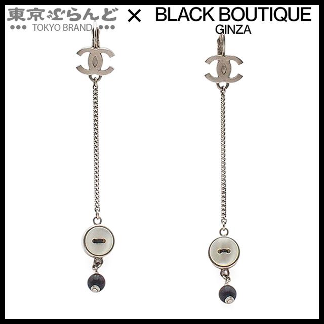 241 CHANEL Earrings, Silver and Black, Metal, Shell, Resin, Swing COCOmark Button, Chain, 08A, Women's