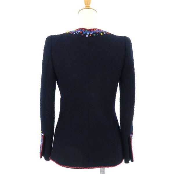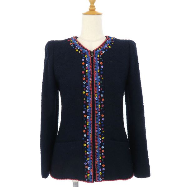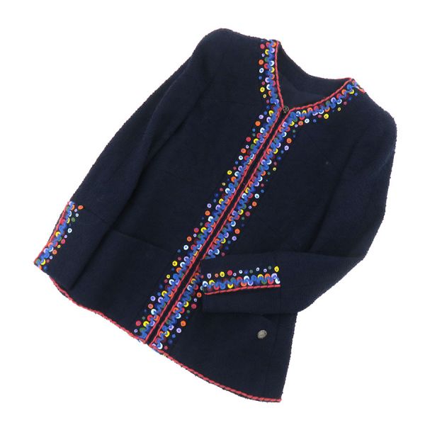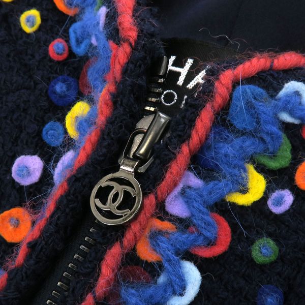 ■採寸#36 肩幅:34cm 袖丈:58cm B:80cm 着丈:58cm■素材表地:ウール88% ナイロン12% 裏地:シルク9% スパンデックス5%■コメントシャネルから97Aジャケットが入荷しました!カラフルなフェルト装飾が目を引く、フロントジップ仕様のノーカラージャケット☆やや長めの丈感と、ウエストをすっきり見せる美しいシルエットが素敵な一着です!全体に生地特有の起毛、ジッパーつまみ根元に極僅かなメッキ剥げ、装飾の毛糸部分や襟周り・袖先・裾のフチにやや毛羽立ち、裏地背中心部分ウエストから腰にかけて薄茶色っぽい汚れが見受けられる為Bランクでのご紹介です。着用時に目立つダメージや汚れはなく、まだまだ問題なくご着用いただけるお品となっております◎
