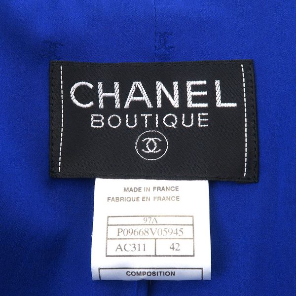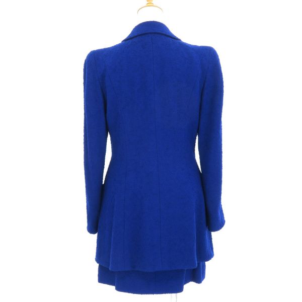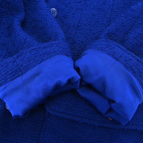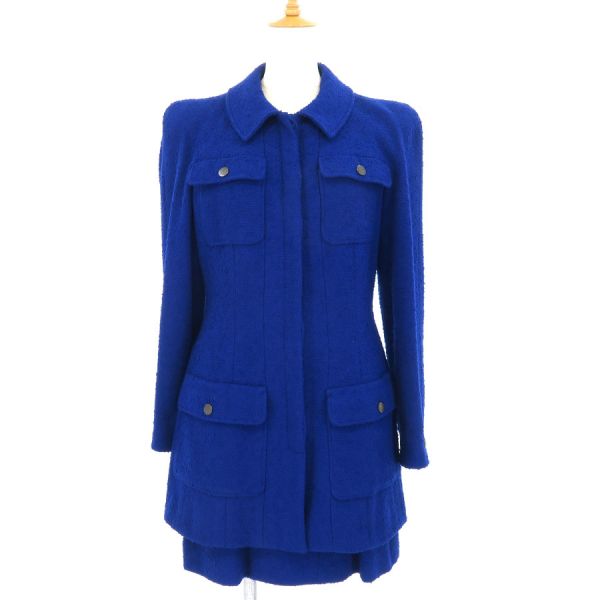 ■採寸#42ジャケット 肩幅:41cm 袖丈:63cm B:90cm 着丈:78cmスカート W:76cm H:104cm 総丈:45cm■素材表地:ウール88% ナイロン12% 裏地:シルク95% スパンデックス5%■コメントシャネルから97Aセットアップが入荷しました!鮮やかなロイヤルブルーが目を惹く、気品と華やかさを兼ね備えた存在感抜群の一着☆ジャケットは丈感が長めのミドル丈となっております!全体にツイード生地特有の起毛感や収納臭・糸埃の付着、ジャケット両袖口内側に薄く写真に写らない程度の黒っぽい汚れ、両脇下裏地に汗シミ、スカートポケット部分のヨレ、ウエスト両サイド前後にハンガー留め跡が見受けられる為Bランクでのご紹介となりました。着用時に目立つダメージや汚れはなく、まだまだ問題なくご着用いただけるお品かと思います◎