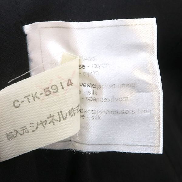 ■採寸#38 肩幅42cm 袖丈59cm B90cm W76cm 着丈64cm■素材ウール51% レーヨン44% ナイロン5%裏地 シルク95% スパンデックス5%■コメントシャネルから98Pジャケットが入荷しました!タグに印字薄れ、襟裏の広範囲や袖などに黄ばみ汚れ、ボタンホール横に糸の飛び出し、左襟や左袖裏、左袖先などに糸のホツレ、ボタンにスレキズ、全体に毛羽立ちや収納ジワ、ヨレ、薄汚れが見られるためCランク評価になります。