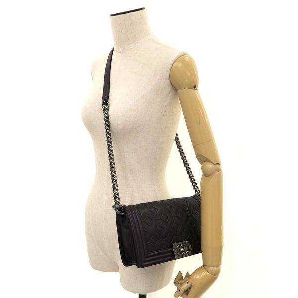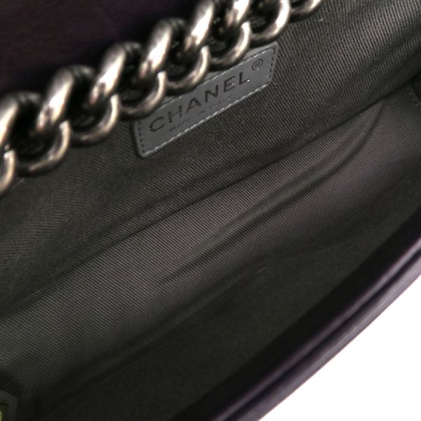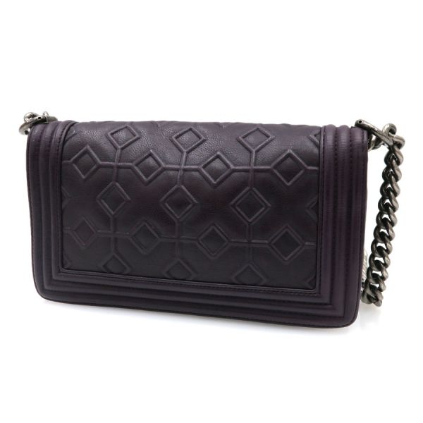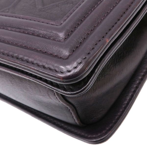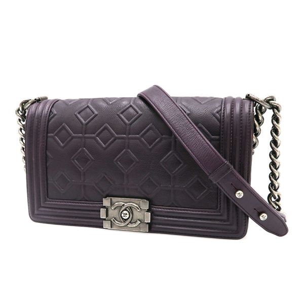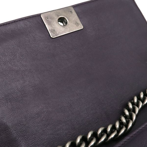 数あるラインの中でも絶大な人気を今日においても誇るショルダーバッグ『ボーイシャネル・チェーンショルダー』の入荷となります。 深みのあるシックなパープル系の色合いにまるで幾何学模様の様なモチーフがあしらわれた独特なデザイン性が魅力となります。 開閉はカブセ蓋のロック式となり、内部にはファスナー付ポケットが1つセットされたシンプルな仕様となり、お財布やスマートフォンといった小物類の持ち運びにピッタリなバッグです。 今回はBランクの入荷となり、全体的な使用感及びダメージに加え本体僅かな型崩れ、表面部における擦れ感、間口の角擦れ、本体角擦れ、ショルダー部レザーの擦れ、本体正面レザー部における金具の押し跡及び擦れ、被せ蓋裏側の擦れ及び爪傷、バッグ内部の生地擦れを感じる状態となります。 使用感はございますがBランクの範疇内となり、まだまだ充分活躍してくれるアイテムと言えますよ!!