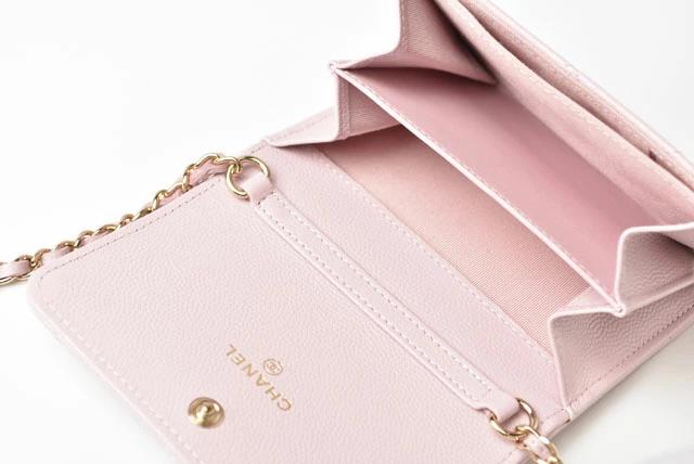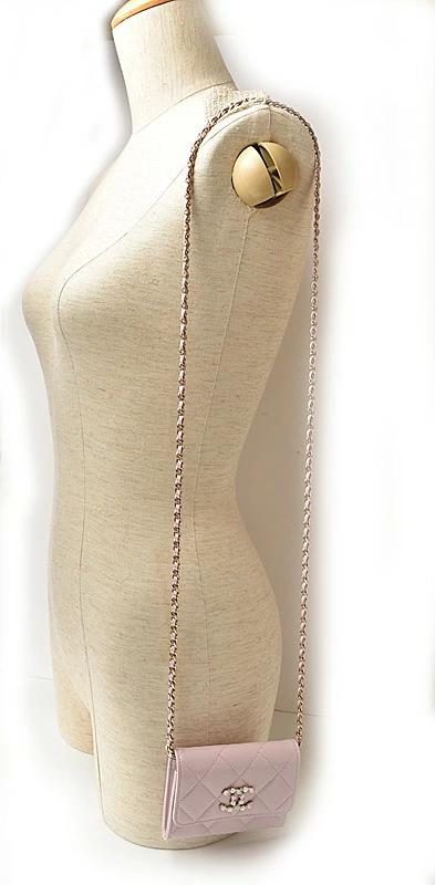 シャネルより、斜め掛けができるチェーンのついたチェーンウォレット/ミニポーチです。大変人気があり、入手困難。多機能なマルチウォレットです。カード、コイン、小物が収納できます。