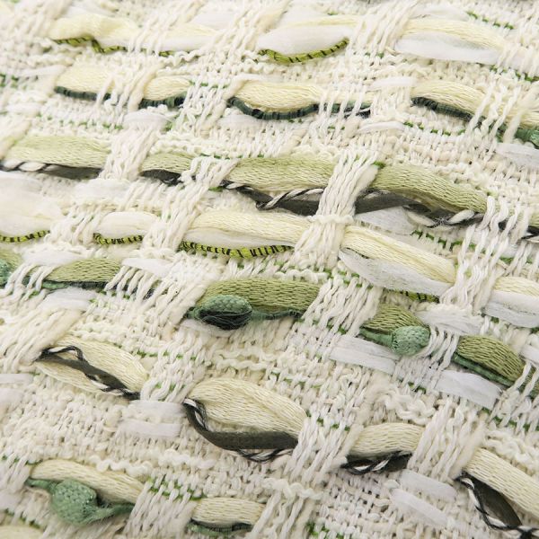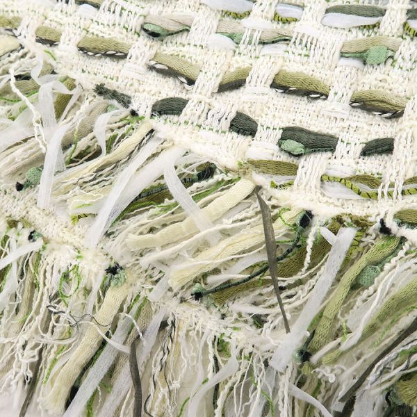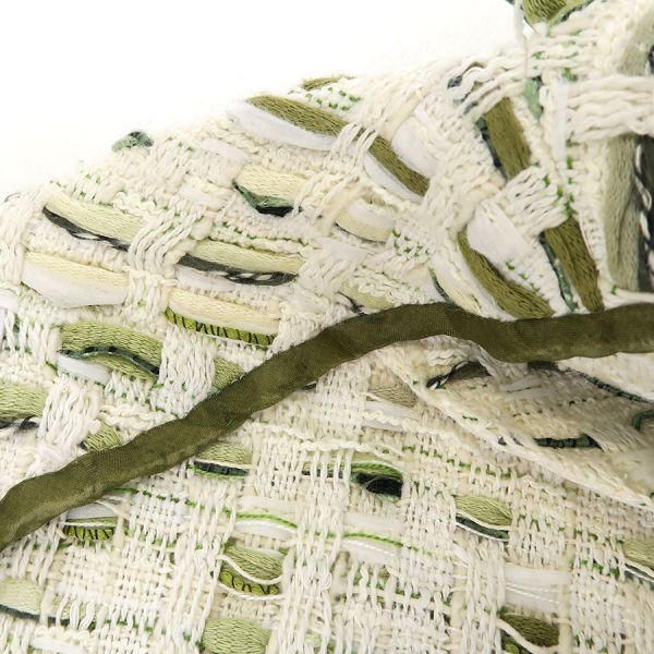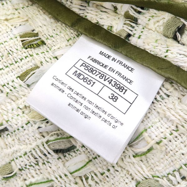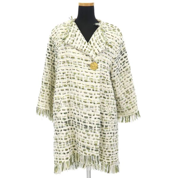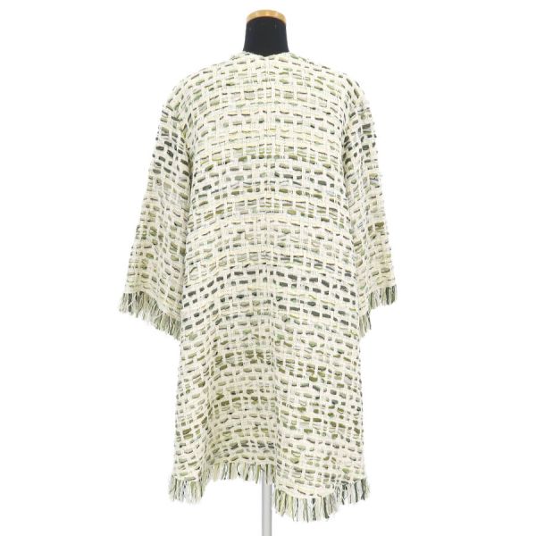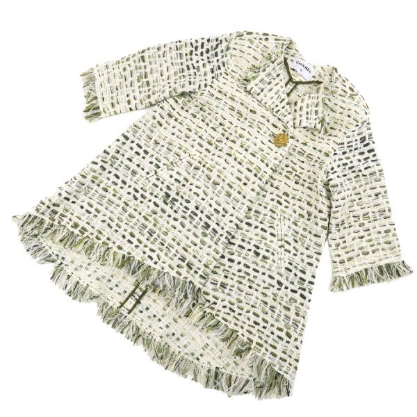 ■採寸#38 肩幅:45cm 袖丈:41cm(フリンジ除く) B:110cm 着丈:86cm(フリンジ除く■素材表地:コットン42% アクリル35% ナイロン11% レーヨン5% ポリエステル2% ウール2% シルク2% リネン1%その他:シルク100%■コメントシャネルからコートが入荷しました!フリンジによるラフさに、後下がりのハイ&ロー丈のエレガントさが加わった、大胆なオープンウィーブのツイードコートです☆ホワイトをベースにオリーブグリーンやカーキ系のリボン状の繊維が織り込まれた、立体感のあるデザインになっております!全体にツイード特有の織り糸の弛みやフリンジのヨレ、ボタンのスレキズが見受けられるものの、目立つダメージや汚れはなくキレイめなお品となっております◎ポケットのしつけも付いたままです!