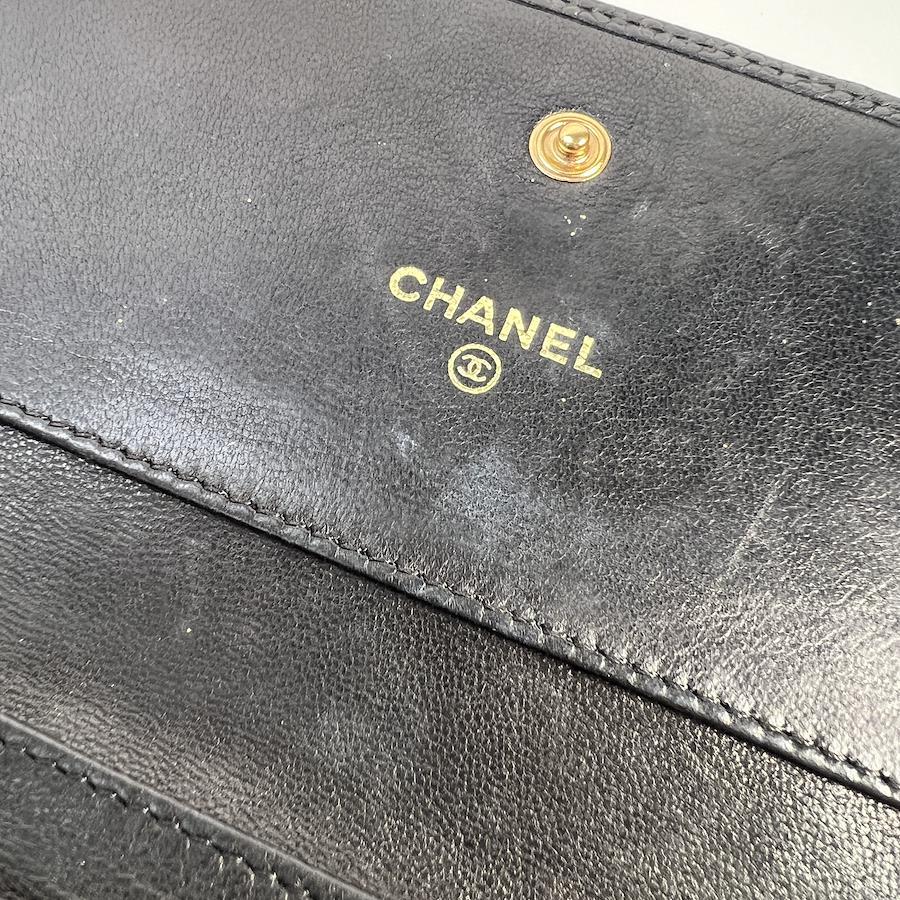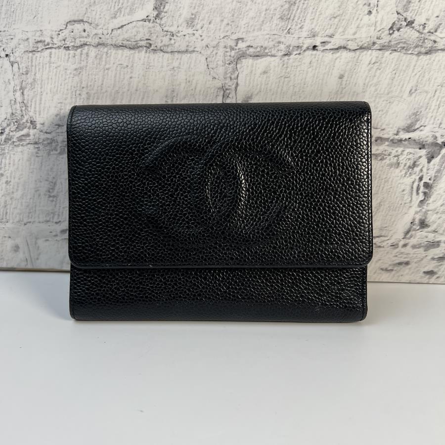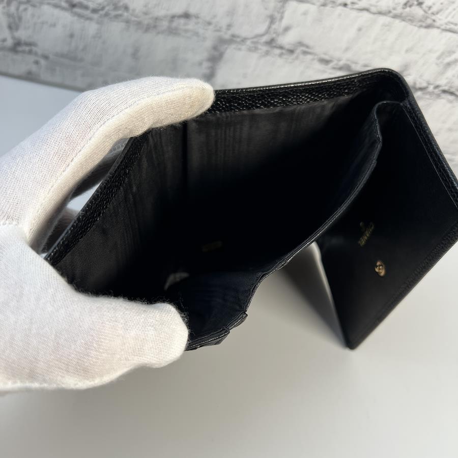 良品 CHANEL シャネル ココマーク キャビアスキン 三つ折り財布 ブラック A-8498