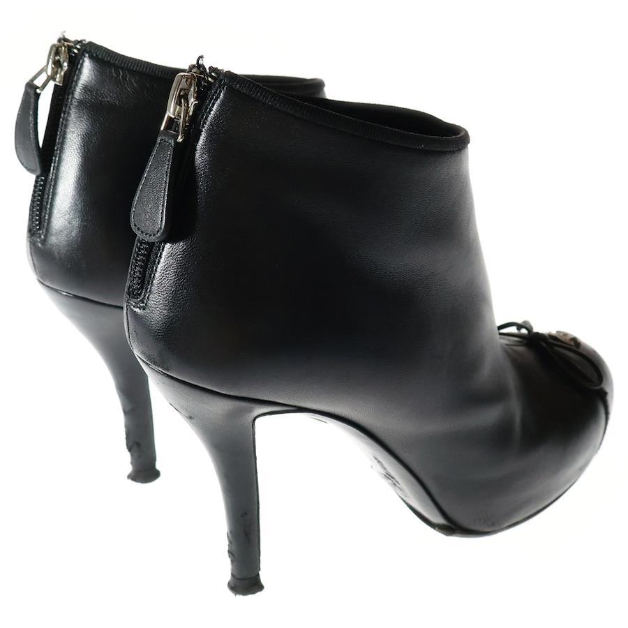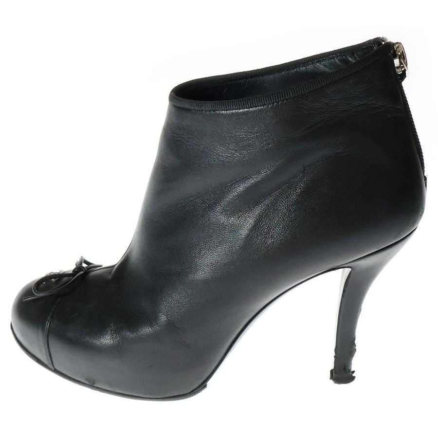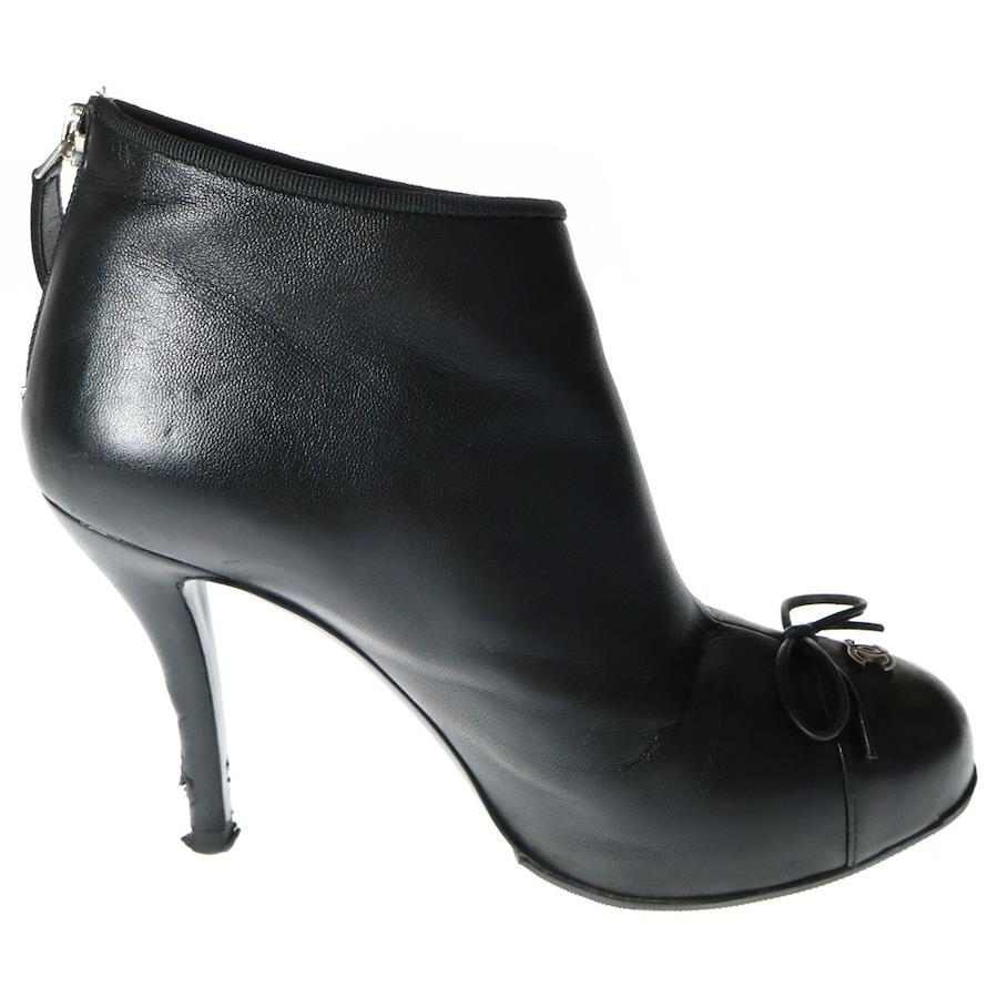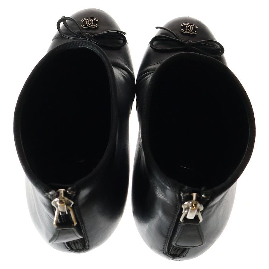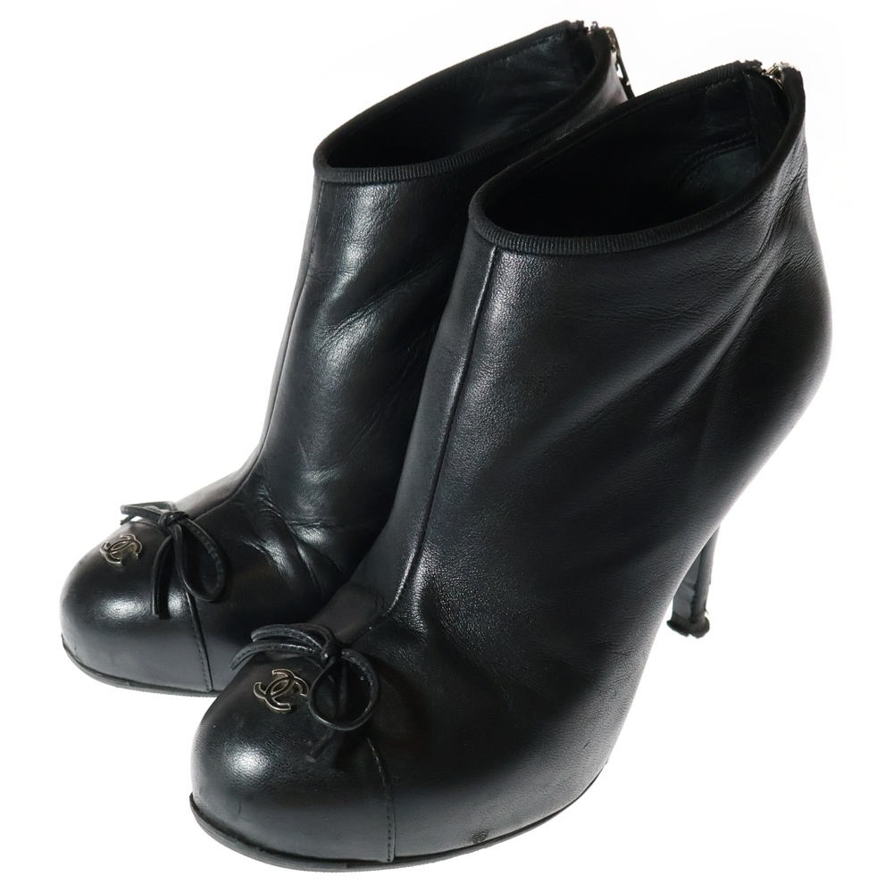 Chanel Coco Mark Ribbon Design Pointed Toe High Heel Short Leather Boots Women's Black Size 36.5