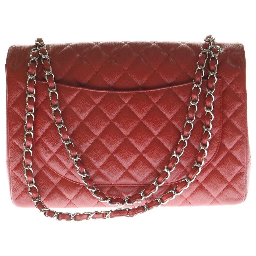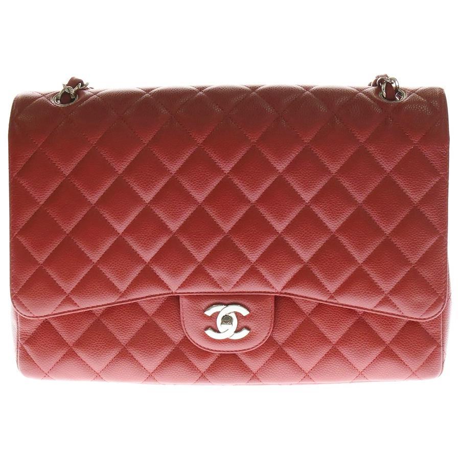Chanel Deca Matelasse 34 Maxi Coco Mark Caviar Leather Double Flap Double Chain Shoulder Bag with Silver Hardware, Red, Size 13