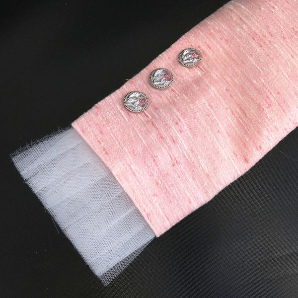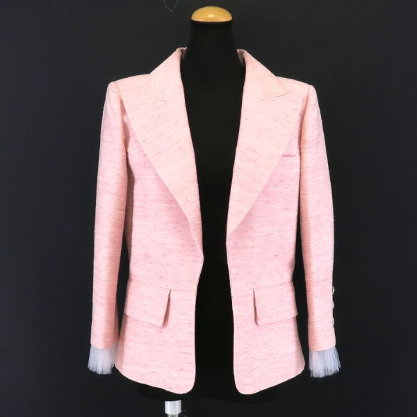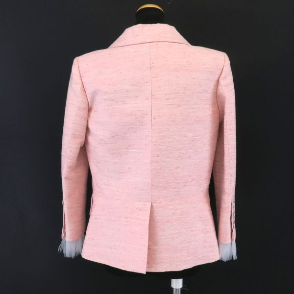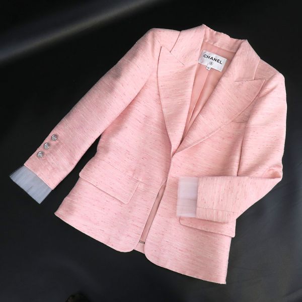 ■採寸#34 肩幅:38cm 袖丈:54cm B:88cm 着丈:58cm■素材シルク100% 裏地:シルク100% カフス:ポリエステル100%■コメントシャネルからジャケットが入荷しました。エレガントな尖った襟に、袖にはココマークロゴボタンにホワイトのフリルが施されている、フォーマルさと華やかさを兼ね備えた素敵なジャケットです☆状態はやや端に毛羽立ちがある程度の、目立つ汚れやダメージはない良好品になりますので、Aランクでのご紹介です。まだまだ長くご着用いただけます◎