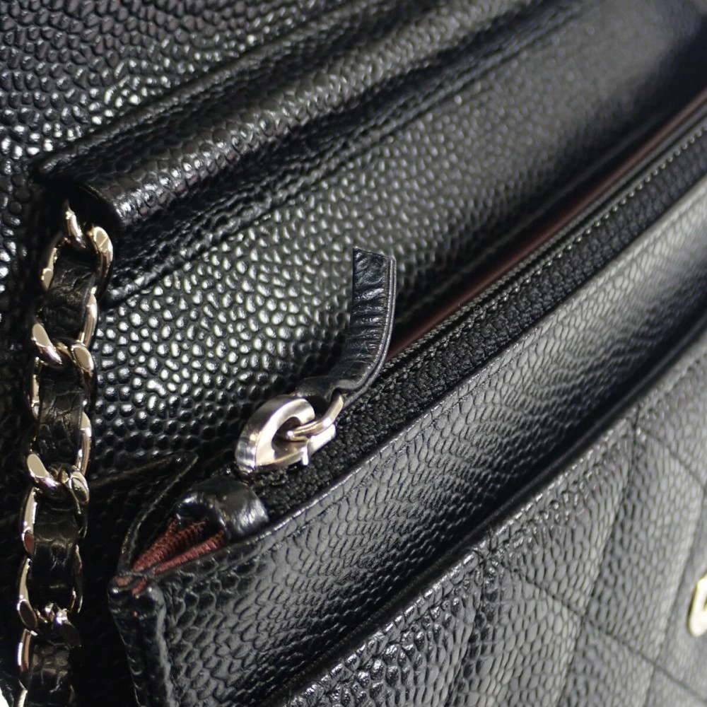 上質なキャビアスキンにフロントの小さなココマークがアクセントになった、シャネルの人気アイテム。
