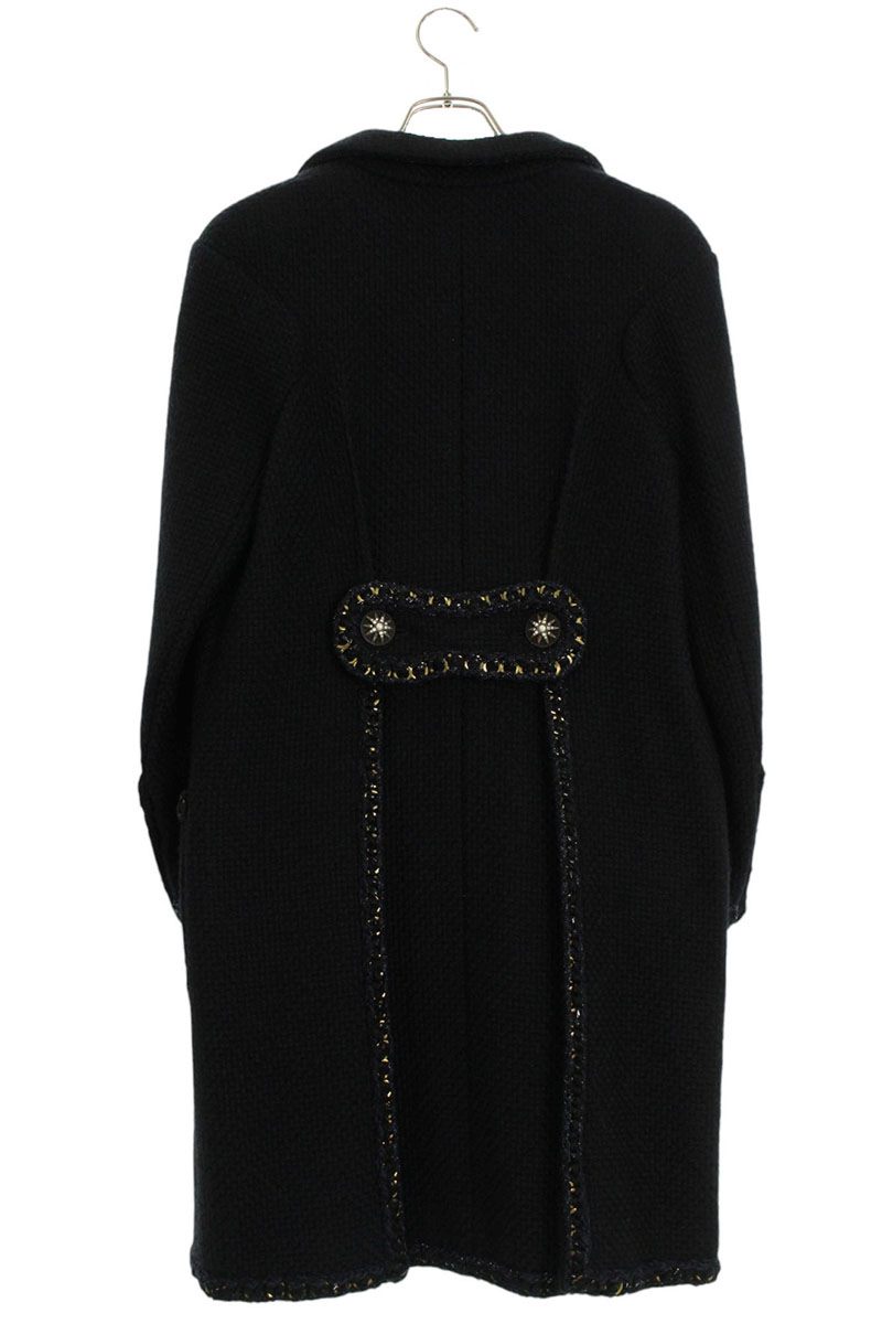 ランク:B (使用感がある商品)状態備考:首タグに汚れがあります全体的に若干の毛羽立ちがありますブランド:シャネルサイズ:36色:ブラック×ゴールド実寸:肩幅43.5cm 身幅45.5cm 着丈88cm 袖丈54cm重さ:-素材:(表地) アルパカ76%、ウール19%、ナイロン5% (裏地) シルク付属品:なしその他特徴:-管理番号:10102-250811-0066