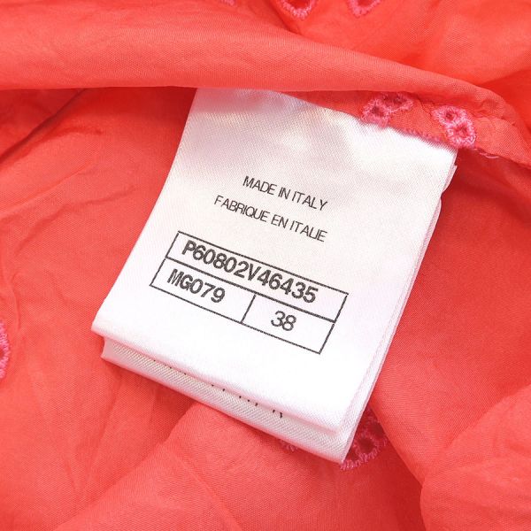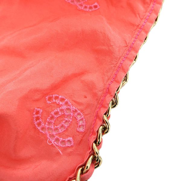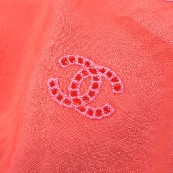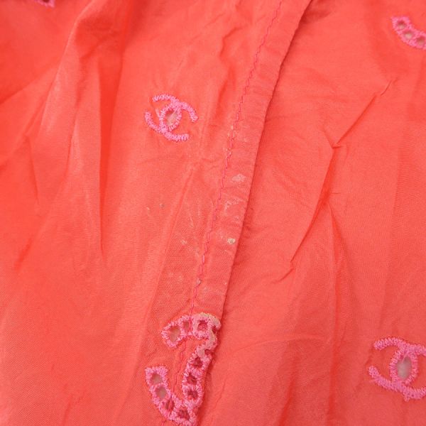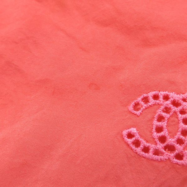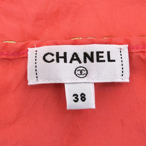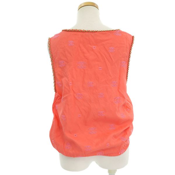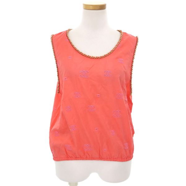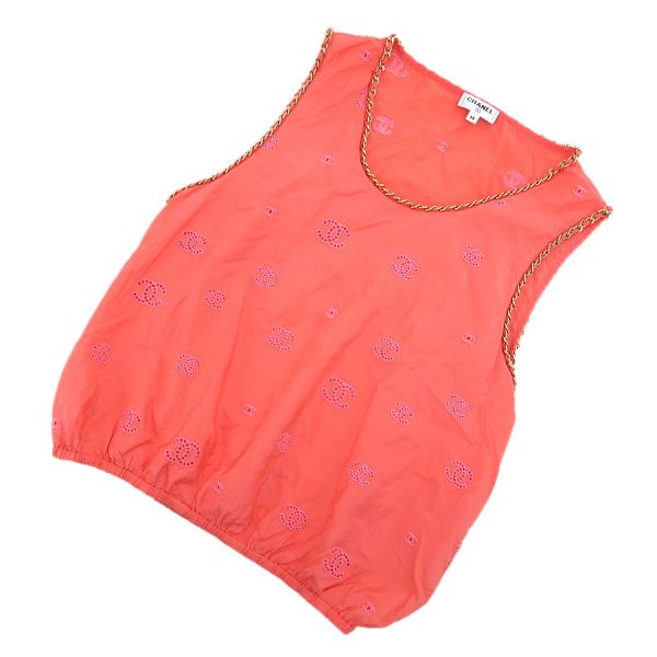 ■採寸#38 肩幅:33cm アームホール:約56cm B:90cm 着丈:50cm■素材表地:シルク100% インセット:シルク100cm■コメントシャネルからトップスが入荷しました!サーモンピンク系の光沢のあるシャカシャカとした生地全体にココマーク刺繍が施されたノースリーブです☆ココマーク部分は穴の開いた透かしデザインとなっており、裾にはゴムが入っております!全体にシワ、前身頃右胸付近に水シミのような点汚れ、内側左側面縫い合わせ部分に白い汚れ、後身頃側左アームホールに茶色の点汚れ、襟やアームホールのチェーンにややスレキズ、裾のヨレ、全体ココマーク刺繍に糸の飛び出しや若干の毛羽立ちが見受けられる為Bランクでのご紹介となりました。着用感はあるものの、目立つダメージや汚れはございませんので普段着としては問題ない程度かと思います◎