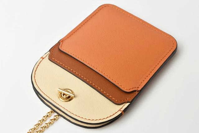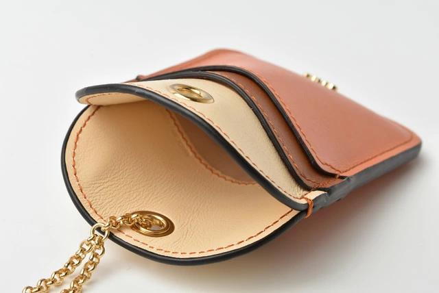 クロエより、カードケースです。「Walden」チェーン付きカードホルダーは、4つのカードスロットが付いたコンパクトなワンポケットアクセサリー。取り外しが可能なゴールドのブラスチェーンがジュエリーのような雰囲気を添えると共に、首に掛けて使えるようにします。