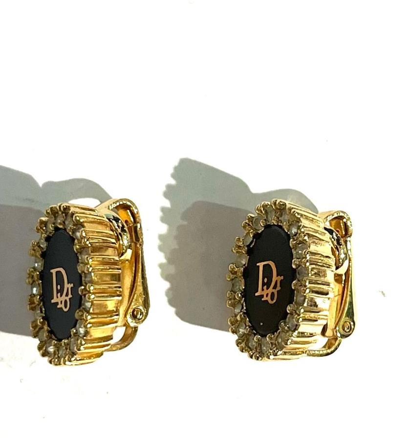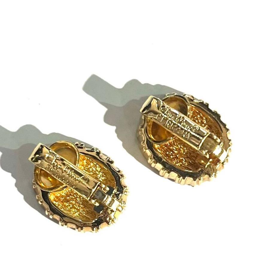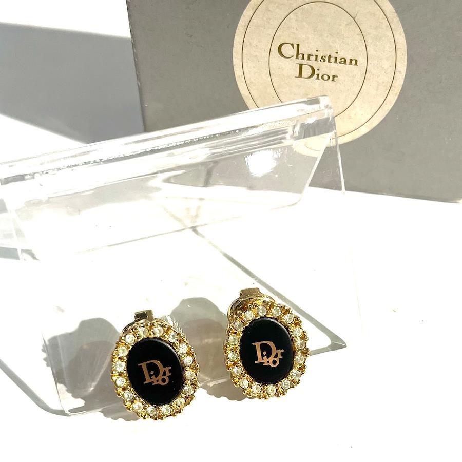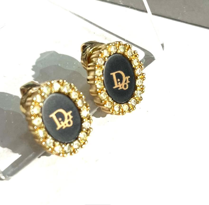 商品説明**Christian Dior(クリスチャン・ディオール)**のロゴを中央にあしらった、1980〜1990年代頃のヴィンテージイヤリング。深みのあるブラックエナメルの中央にゴールドの「Dior」ロゴが輝き、周囲を囲むクリアストーンが繊細に光を反射します。