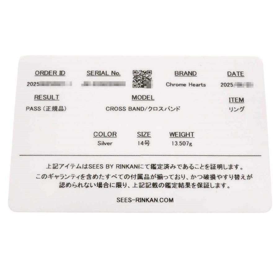 Product Rank: ABBrand: Chrome HeartsProduct Name: Cross Band RingSuitable for: UnisexShape: RingAccessories: Appraisal Card (RINKAN)Model Number:Size: 14, Width: Approx. 0.6cmPlease note that measurements are taken by hand and there may be slight variations.Note: Regarding Reference Sizes (equivalent to Japanese Sizes):Products listed with a reference size are approximate Japanese sizes.Please note that sizes may vary depending on the brand, product, and design, so please use this as a guide only.Please note that sizes are measured by hand, so please compare them with your own clothing before purchasing.Material: SV925Please check the product tag image for the material details.Items without tags and no specific description here are subject to availability.Thank you for your understanding.Weight: 13.5gProduct SpecificationsColorMaintenance: Cleaned by our company.Note:Some scuffs and dents.CH CROSS BAND SilverThis item is stored in a separate warehouse, so we may not be able to respond immediately.Please contact us by email or with any questions.Rings, Accessories
