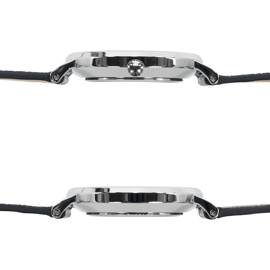 漆黒のブラックダイヤルに、シャープなバーインデックスが映え、ミニマルな美しさを際立たせます。