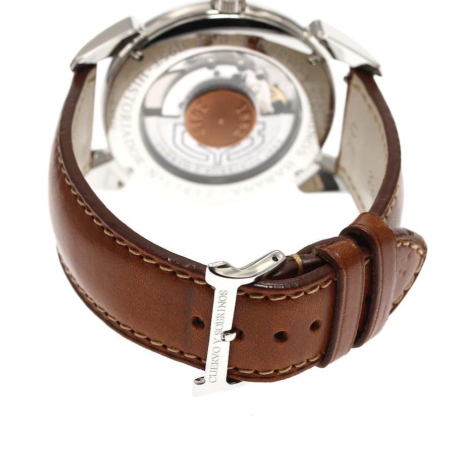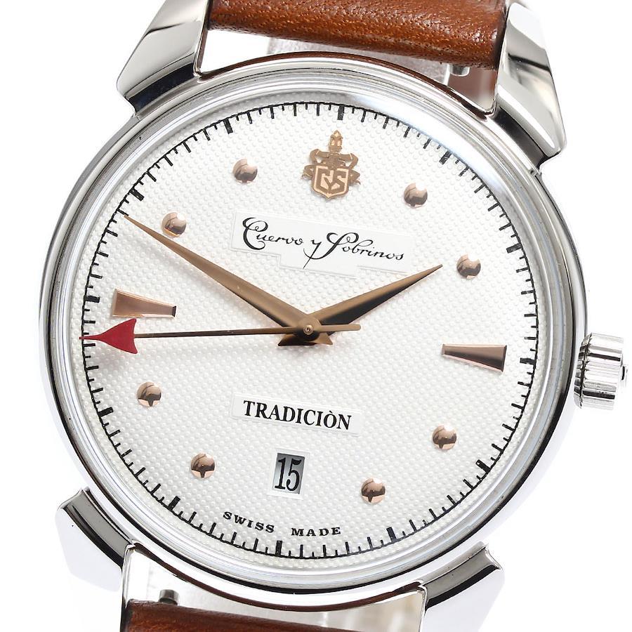 ■商品情報ブランド: クエルボ・イ・ソブリノス/CUERVO Y SOBRINOSモデル名: ヒストリアドール トラディション対象: メンズ素材: SS × 革文字盤色: シルバームーブメント:自動巻きRef.No: 3195-1TR-Sシリアル:578**機能・特徴:デイト付属品:なし(本体のみ)ケースサイズ(w):約 40mmベルトサイズ:約 20cm※ベルトサイズとは、ケース部分も含めた総腕回りのサイズになります。ラグ幅: 21mm日差: -37秒/日 ※参考値OH歴: 弊社では実施しておりません。