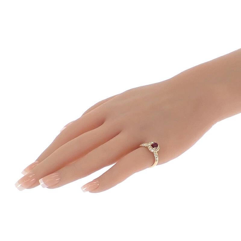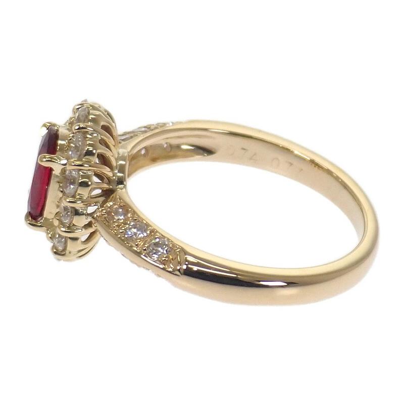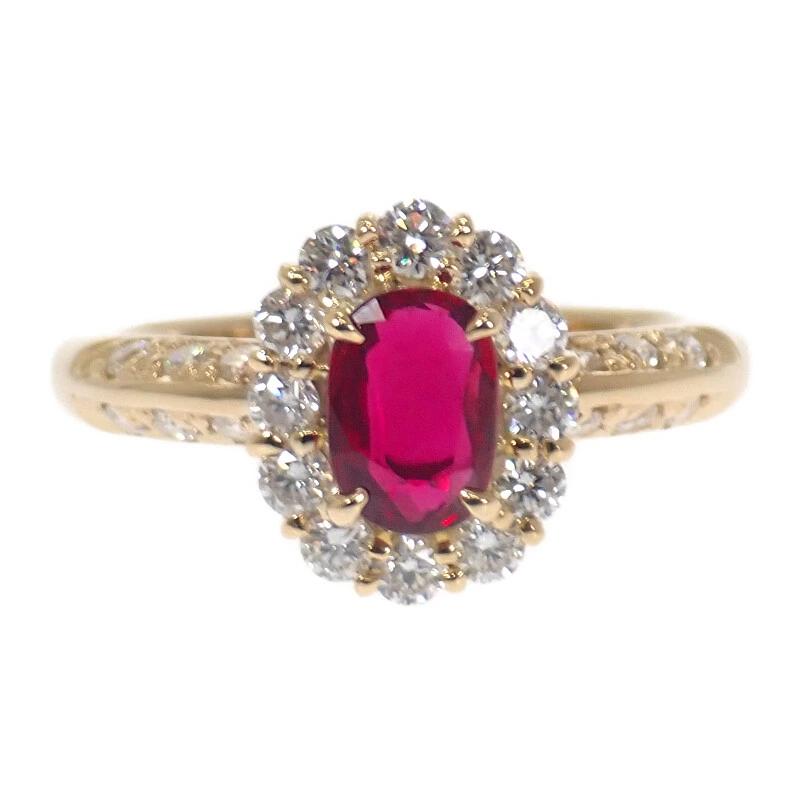 中央の加熱処理されたルビーは深みのある赤が美しく、周囲を囲むダイヤモンドが華やかさと気品を引き立てます。クラシカルなデザインながらも、指元に洗練された存在感を添える逸品。特別な日を彩るにふさわしい、エレガンスを宿したジュエリーです。