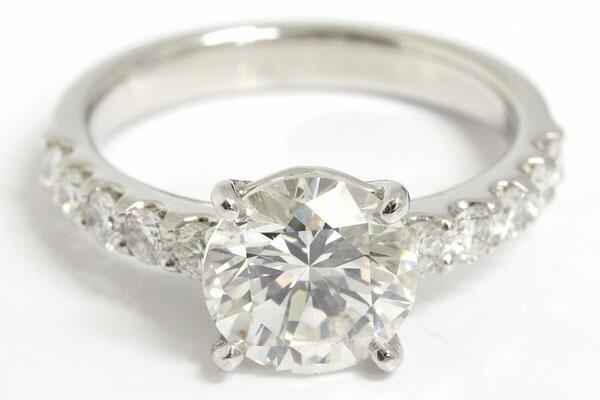 コメント:トップに2ctオーバーの大きい一粒ダイヤモンドと、その両サイドのリングに5Pずつ計10Pの小粒ダイヤモンドがレイアウトされ、真上から見える範囲内ではすべてがダイヤモンドという豪勢なリングです。横から見てもダイヤモンドが厚く、贅沢の一言に尽きます。