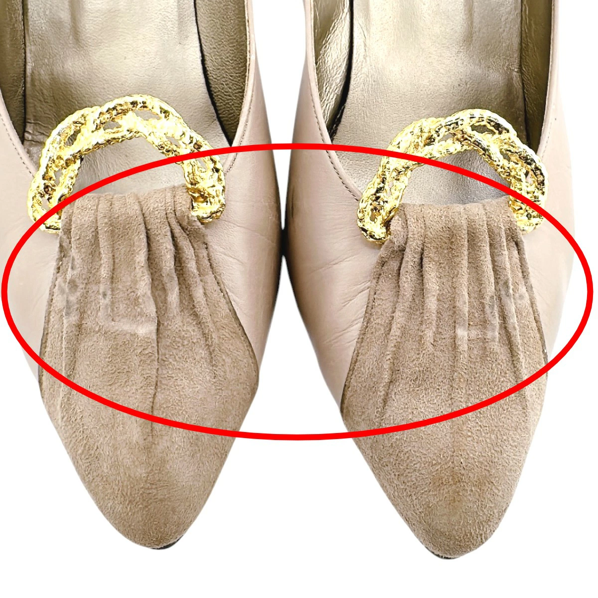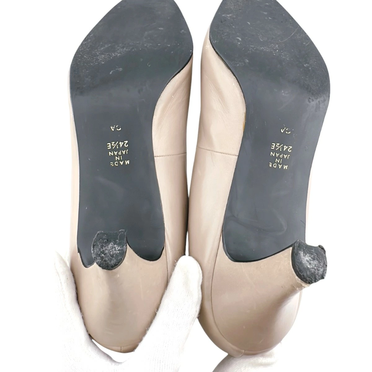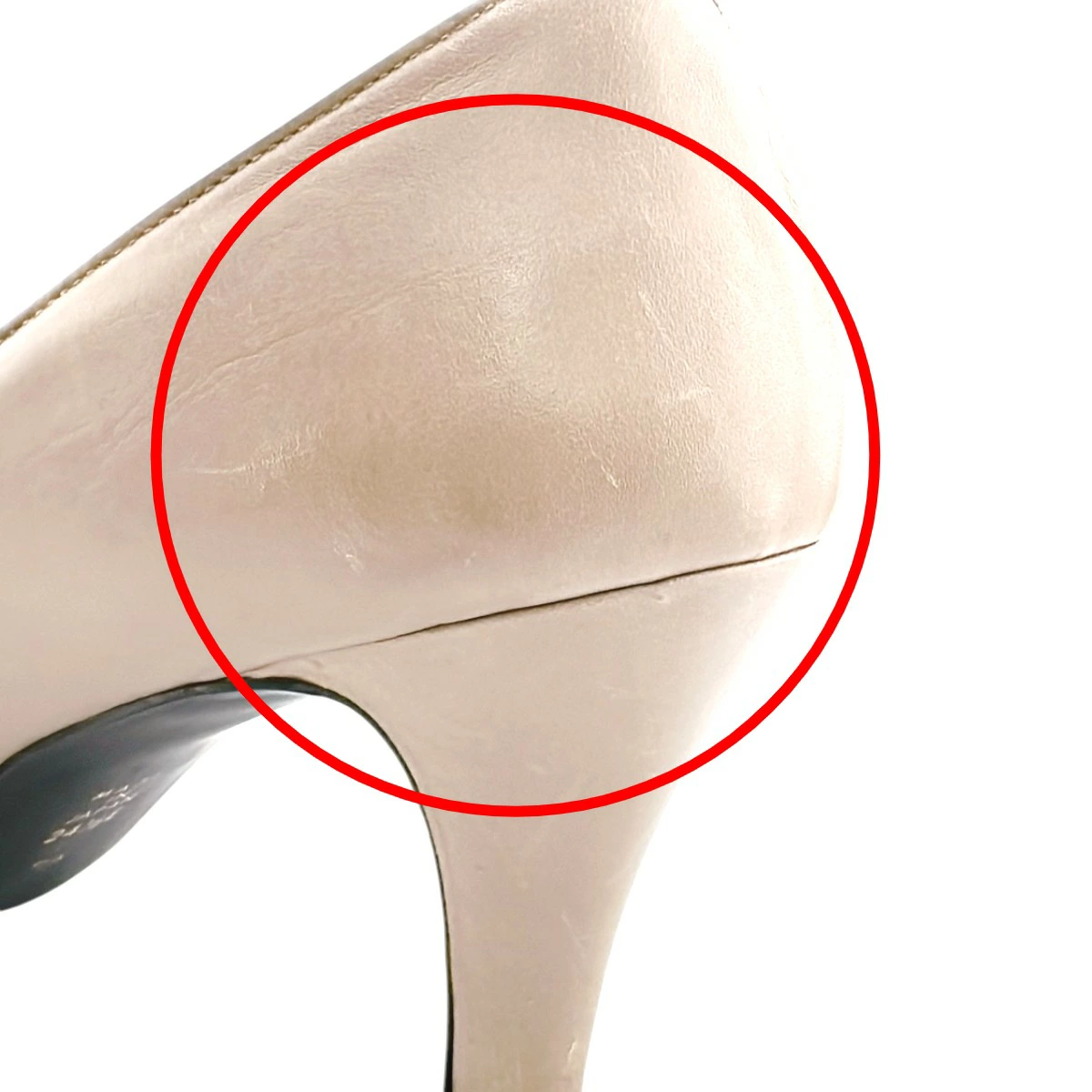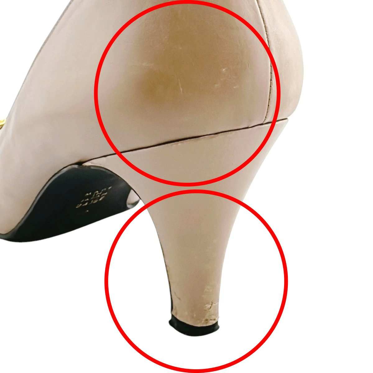 | 外側 | ランク:AB 表面:キズ、小キズ、薄汚れ、スレ、劣化 表面飾り下にスレ・汚れあり(画像6枚目) 側面にスレあり(画像7〜9枚目) 右足側面に剥がれあり(画像10枚目) 踵部分にスレあり(画像11〜15枚目) ヒール部分にスレ・剥がれあり(画像11,15枚目) 靴底に汚れあり(画像16枚目) |