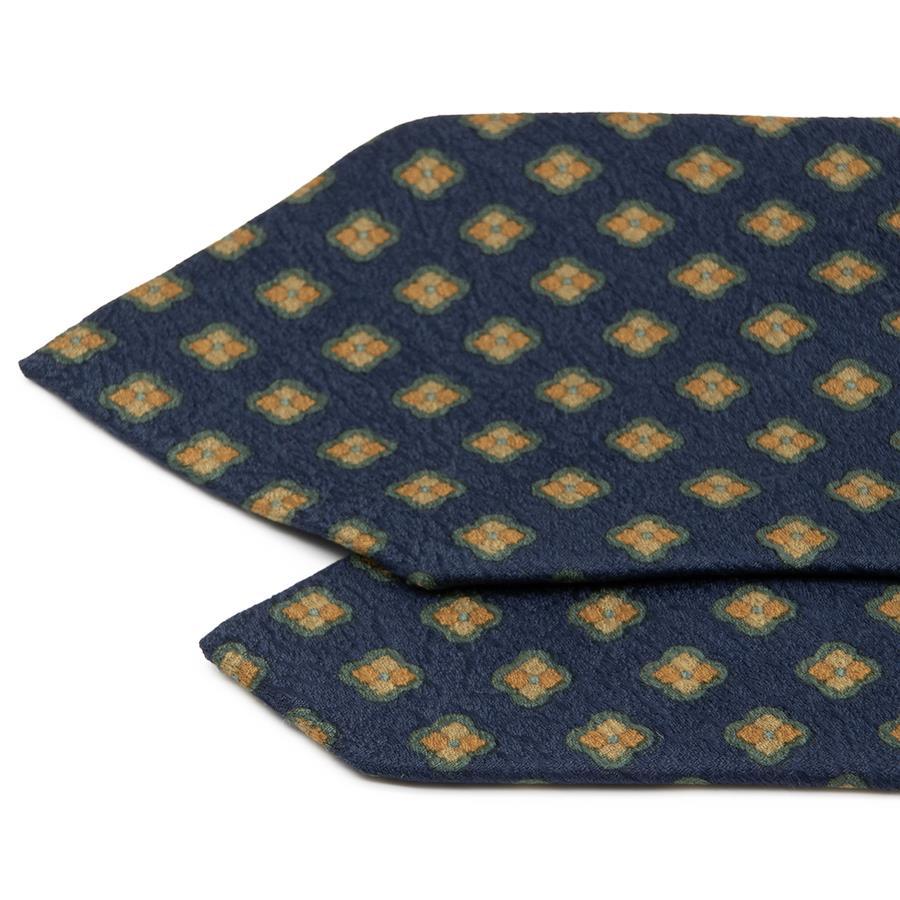 深いナイトブルーの地に、秋色に色づいた木の葉を思わせる、オレンジやイエローの小花が散りばめられております。