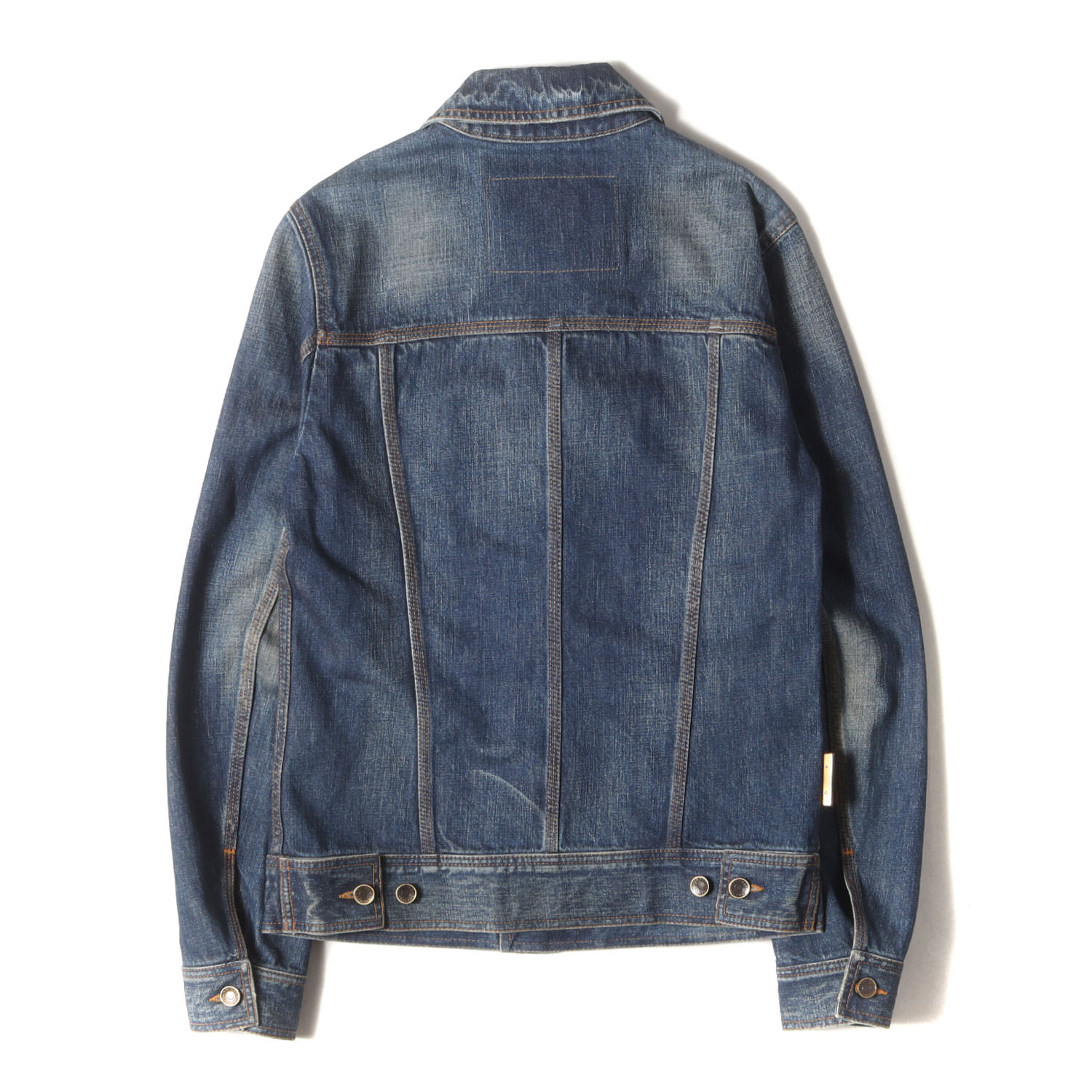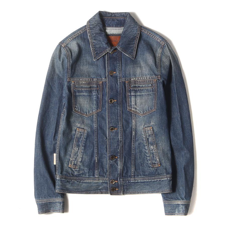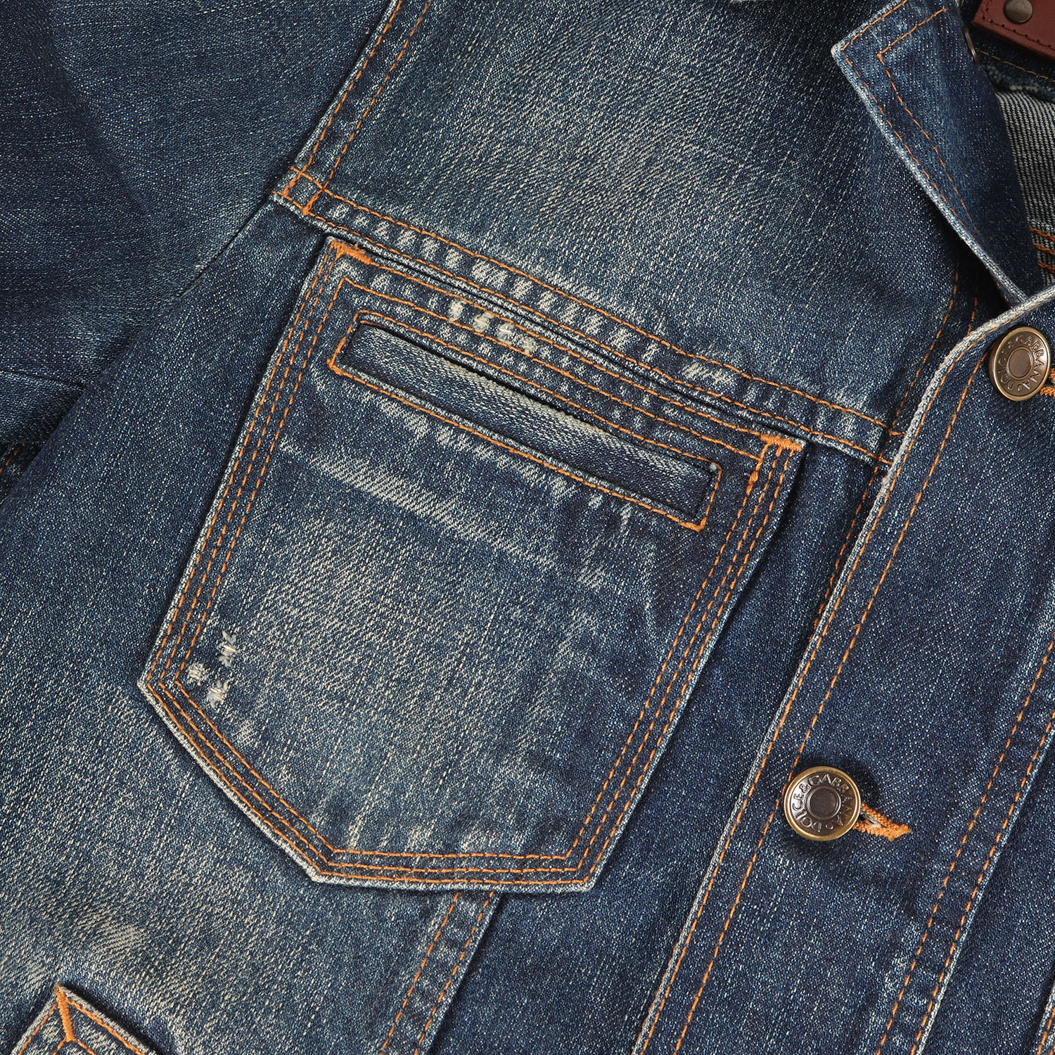 ヴィンテージ加工を施したデニム生地を使用し、ボタンフライで仕上げたトラッカージャケットです。フロントには4つポケットをデザインしています。右サイドに付属したブランドタブ金属パーツがポイントです。